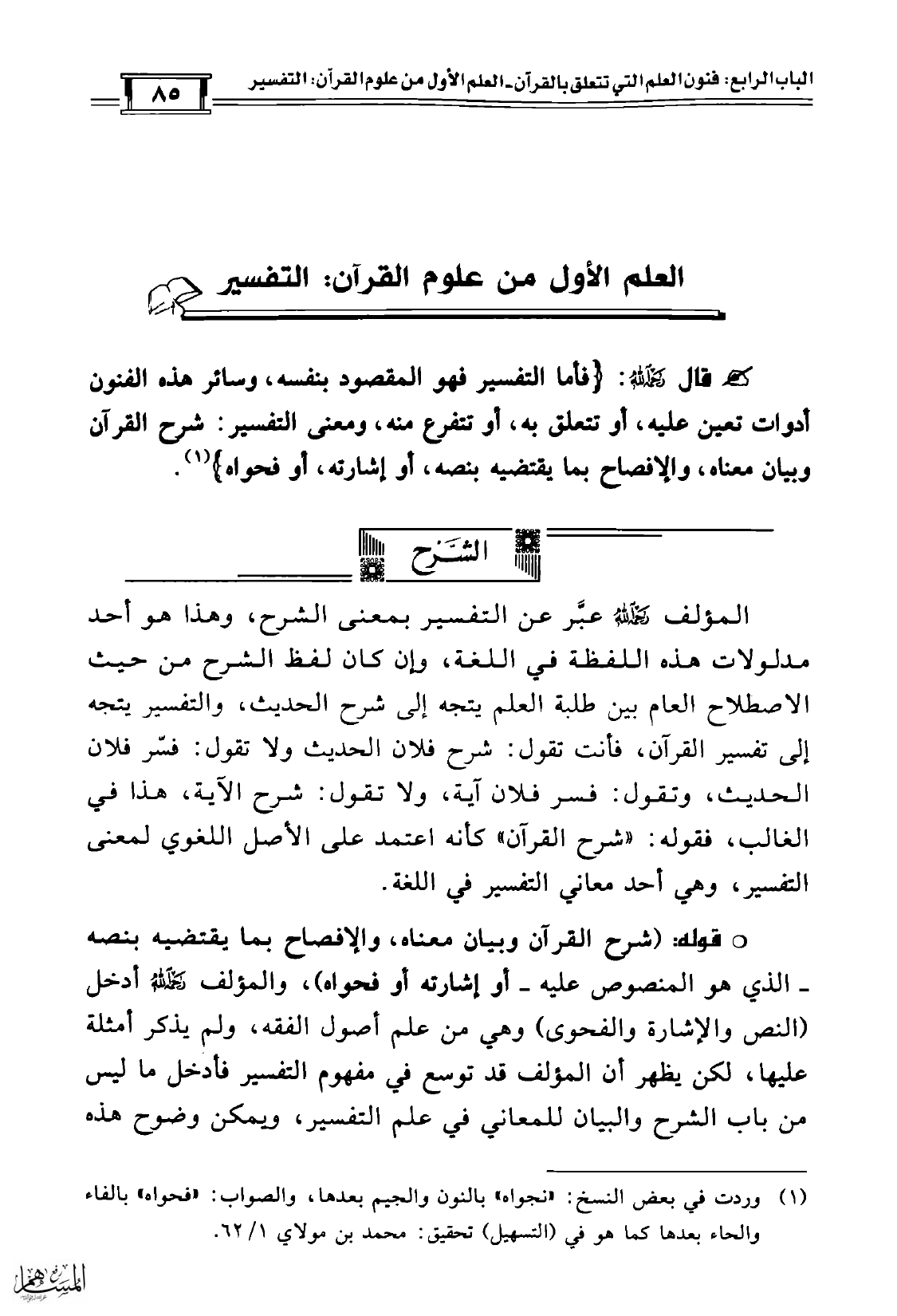 قوله: (شرح القرآن وبيان معناه، والإفصاح بما يقتضيه بنصه ـ الذي هو المنصوص عليه ـ أو إشارته أو فحواه)، والمؤلف رحمه الله أدخل (النص والإشارة والفحوى) وهي من علم أصول الفقه، ولم يذكر أمثلة عليها، لكن يظهر أن المؤلف قد توسع في مفهوم التفسير فأدخل ما ليس من باب الشرح والبيان للمعاني في علم التفسير، ويمكن وضوح هذه
