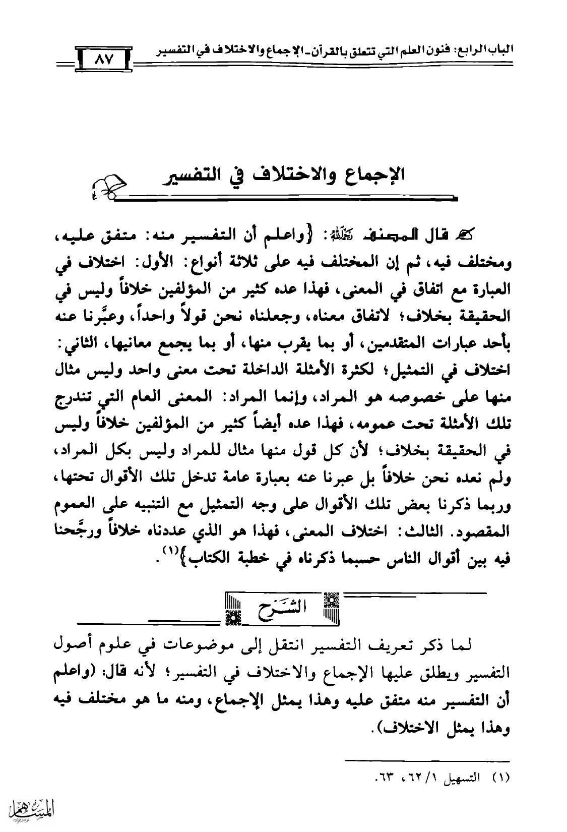 لما ذكر تعريف التفسير انتقل إلى موضوعات في علوم أصول التفسير ويطلق عليها الإجماع والاختلاف في التفسير؛ لأنه قال: (واعلم أن التفسير منه متفق عليه وهذا يمثل الإجماع، ومنه ما هو مختلف فيه وهذا يمثل الاختلاف).