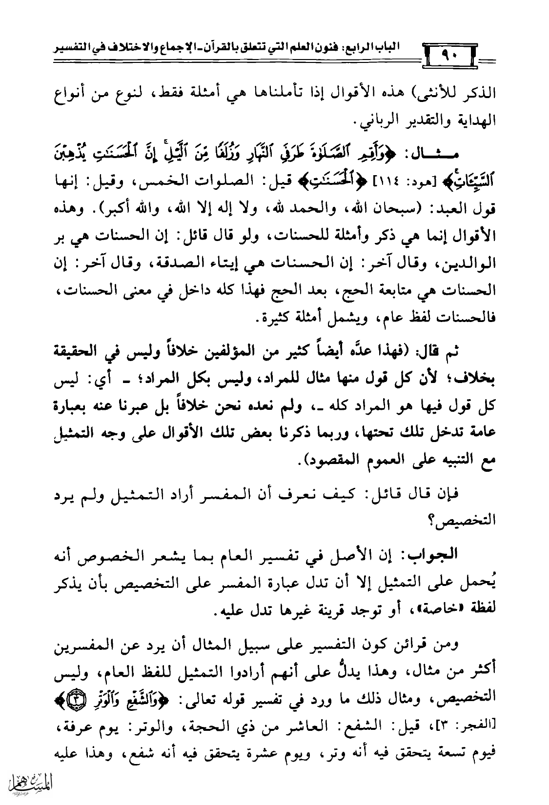 الجواب: إن الأصل في تفسير العام بما يشعر الخصوص أنه يُحمل على التمثيل إلا أن تدل عبارة المفسر على التخصيص بأن يذكر لفظة «خاصة»، أو توجد قرينة غيرها تدل عليه.