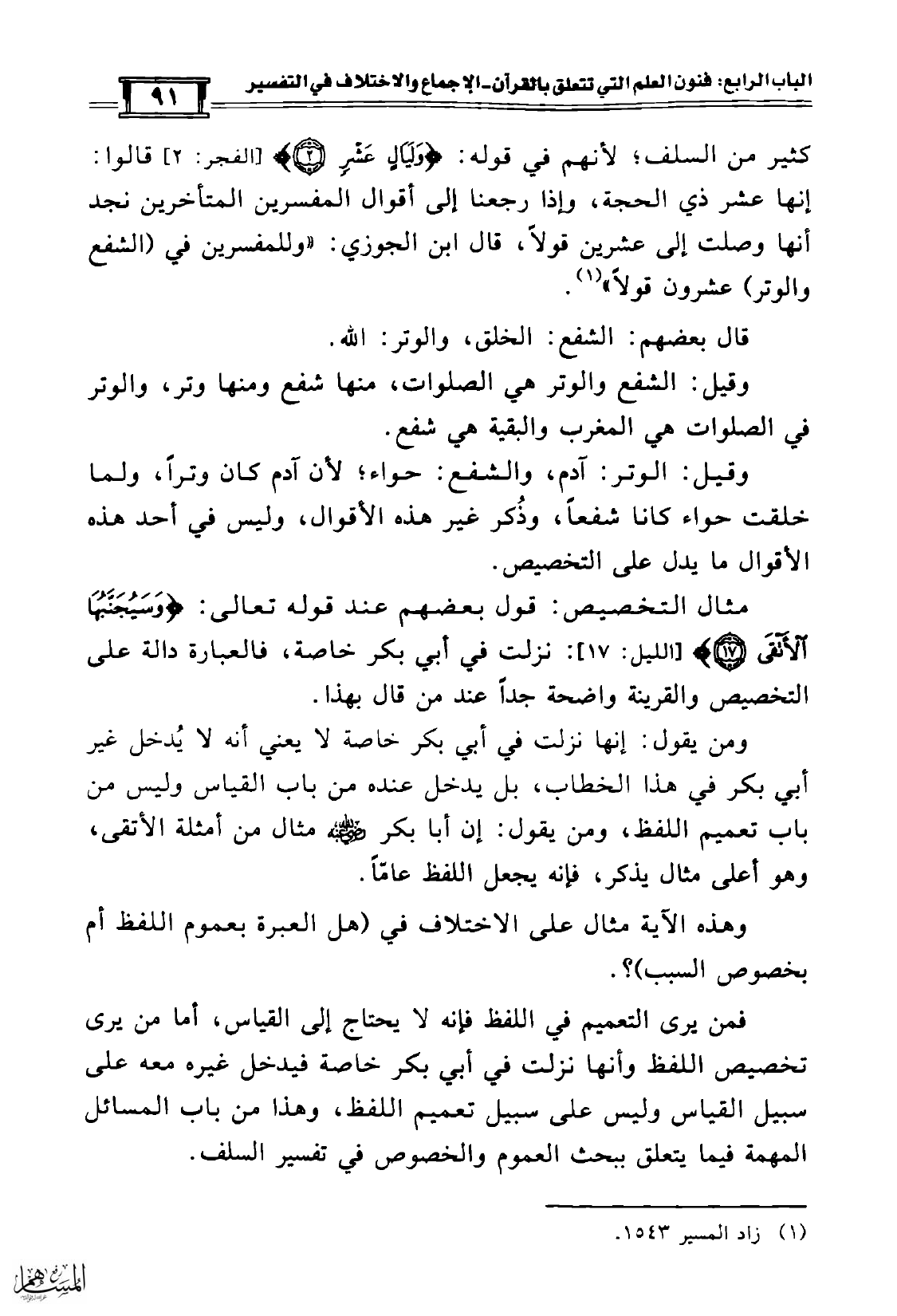 كثير من السلف؛ لأنهم في قوله: {وَلَيَالٍ عَشْرٍ} [الفجر: 2] قالوا: إنها عشر ذي الحجة، وإذا رجعنا إلى أقوال المفسرين المتأخرين نجد أنها وصلت إلى عشرين قولاً، قال ابن الجوزي: «وللمفسرين في (الشفع والوتر) عشرون قولاً» (¬1).