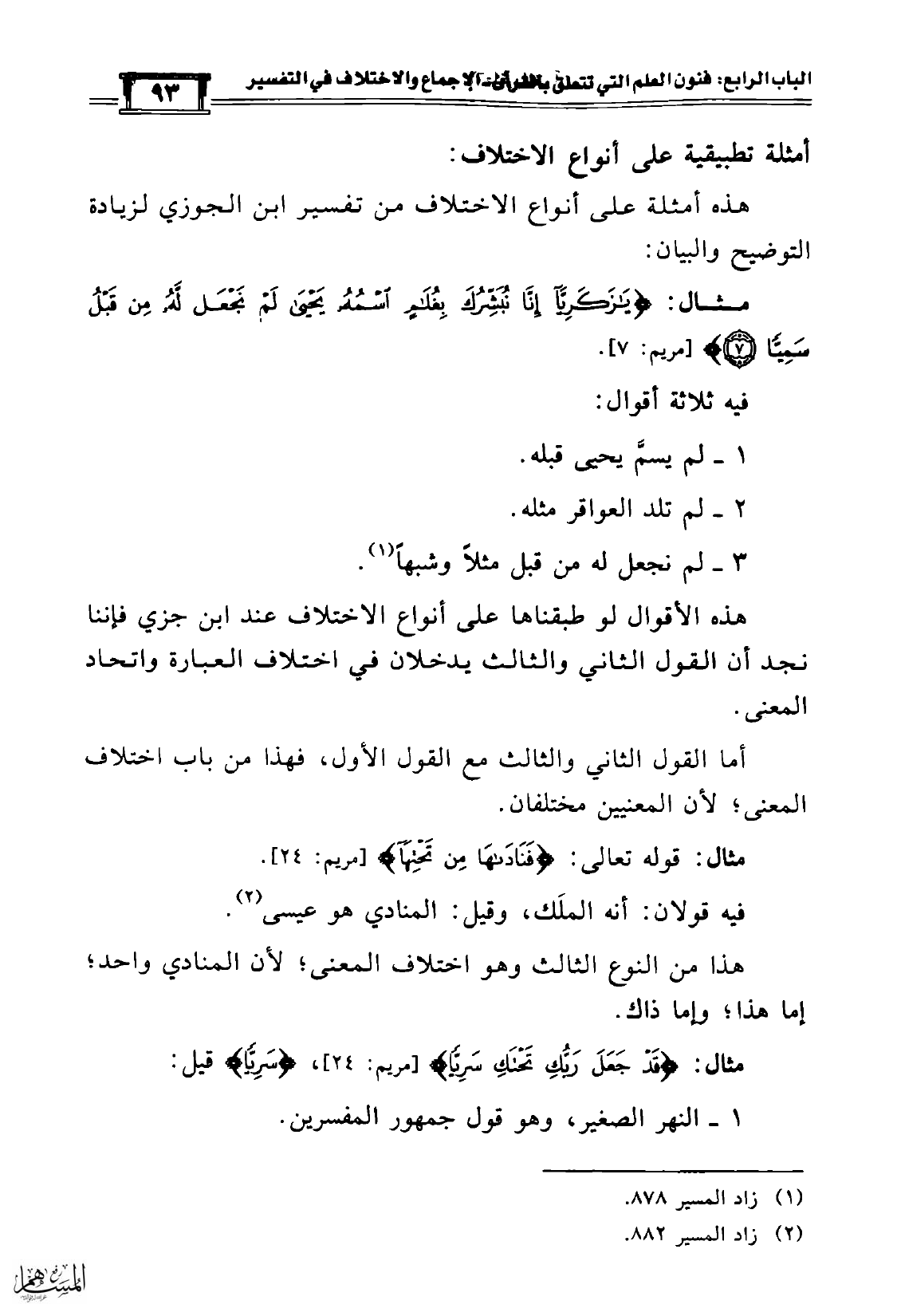 هذه أمثلة على أنواع الاختلاف من تفسير ابن الجوزي لزيادة التوضيح والبيان: