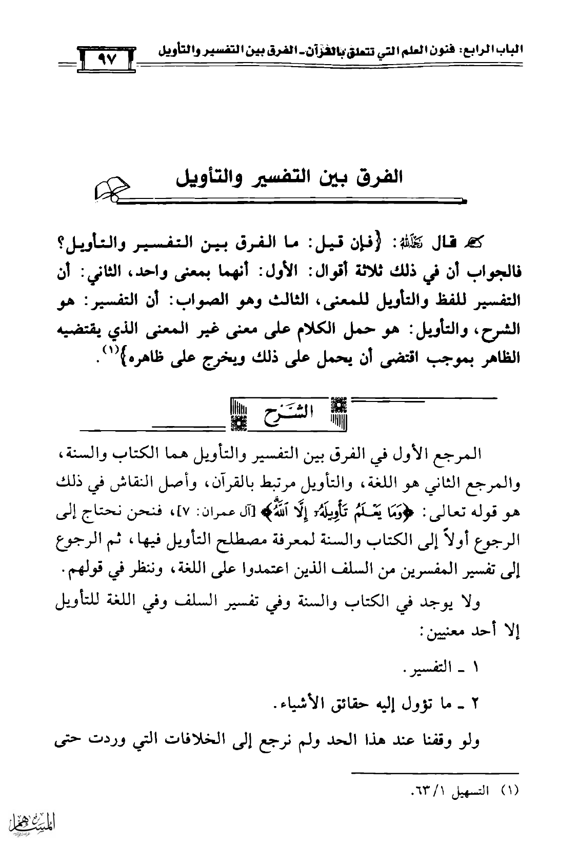 قال رحمه الله: فإن قيل: ما الفرق بين التفسير والتأويل؟ فالجواب أن في ذلك ثلاثة أقوال: الأول: أنهما بمعنى واحد، الثاني: أن التفسير للفظ والتأويل للمعنى، الثالث وهو الصواب: أن التفسير: هو الشرح، والتأويل: هو حمل الكلام على معنى غير المعنى الذي يقتضيه الظاهر بموجب اقتضى أن يحمل على ذلك ويخرج على ظاهره (¬1).