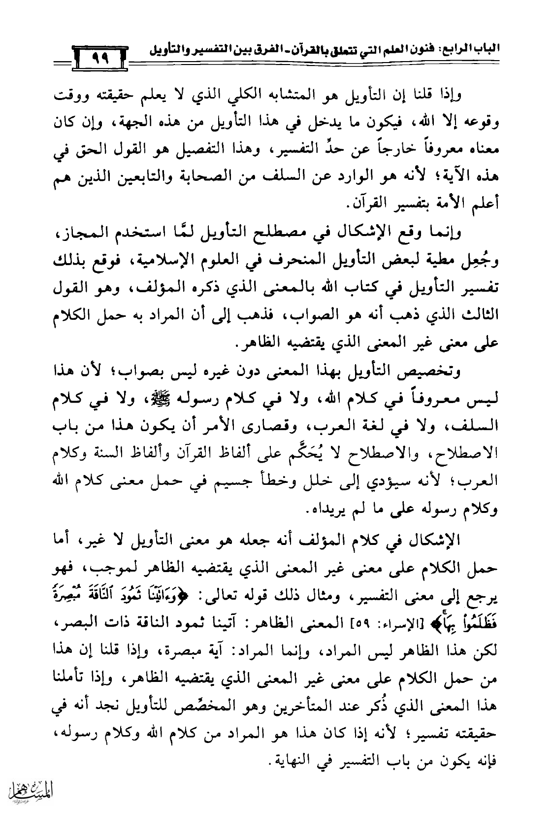 الإشكال في كلام المؤلف أنه جعله هو معنى التأويل لا غير، أما حمل الكلام على معنى غير المعنى الذي يقتضيه الظاهر لموجب، فهو يرجع إلى معنى التفسير، ومثال ذلك قوله تعالى: {وَآتَيْنَا ثَمُودَ النَّاقَةَ مُبْصِرَةً فَظَلَمُوا بِهَا} [الإسراء: 59] المعنى الظاهر: آتينا ثمود الناقة ذات البصر، لكن هذا الظاهر ليس المراد، وإنما المراد: آية مبصرة، وإذا قلنا إن هذا من حمل الكلام على معنى غير المعنى الذي يقتضيه الظاهر، وإذا تأملنا هذا المعنى الذي ذُكر عند المتأخرين وهو المخصِّص للتأويل نجد أنه في حقيقته تفسير؛ لأنه إذا كان هذا هو المراد من كلام الله وكلام رسوله، فإنه يكون من باب التفسير في النهاية.