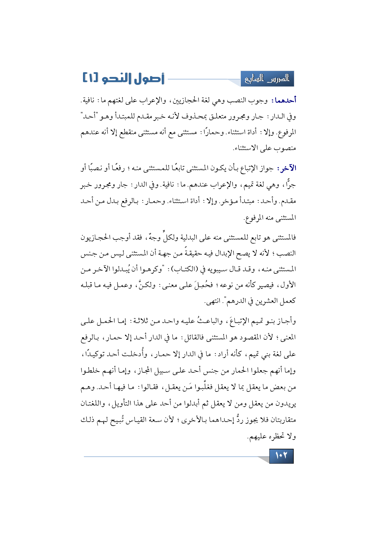 فالمستثنى هو تابع للمستثنى منه على البدلية ولكلٍّ وجهٌ، فقد أوجب الحجازيون النصب؛ لأنه لا يصح الإبدال فيه حقيقةً من جهة أن المستثنى ليس من جنس المستثنى منه، وقد قال سيبويه في (الكتاب): "وكرهوا أن يُبدلوا الآخر من الأول، فيصير كأنه من نوعه؛ فحُمِلَ على معنى: ولكنَّ، وعمل فيه ما قبله كعمل العشرين في الدرهم". انتهى.
