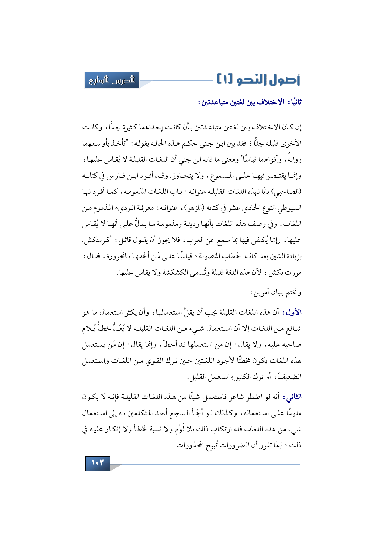 الأول: أن هذه اللغات القليلة يجب أن يقلَّ استعمالها، وأن يكثر استعمال ما هو شائع من اللغات إلا أن استعمال شيء من اللغات القليلة لا يُعَدُّ خطأً يُلام صاحبه عليه، ولا يقال: إن من استعملها قد أخطأ، وإنما يقال: إن مَن يستعمل هذه اللغات يكون مخطئًا لأجود اللغتين حين ترك القوي من اللغات واستعمل الضعيفَ، أو ترك الكثير واستعمل القليلَ.