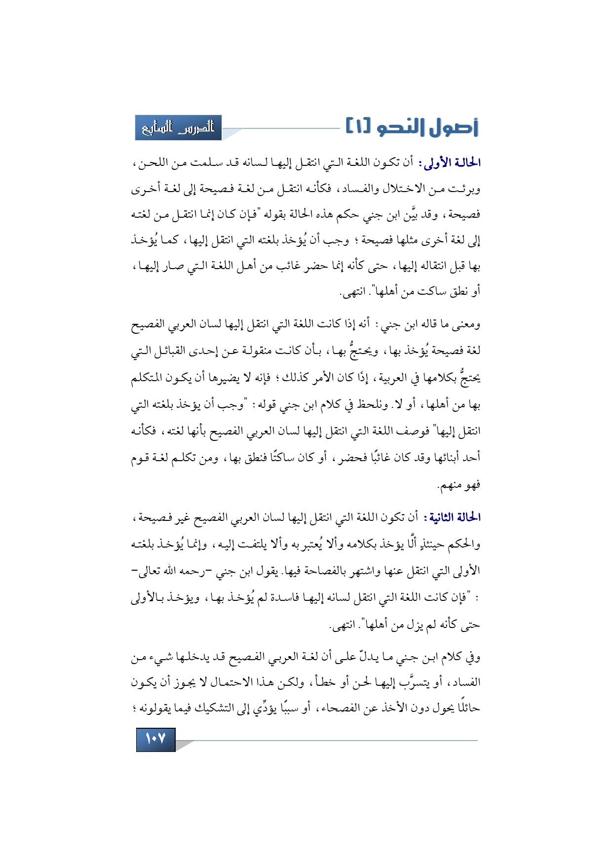 الحالة الأولى: أن تكون اللغة التي انتقل إليها لسانه قد سلمت من اللحن، وبرئت من الاختلال والفساد، فكأنه انتقل من لغة فصيحة إلى لغة أخرى فصيحة، وقد بيَّن ابن جني حكم هذه الحالة بقوله "فإن كان إنما انتقل من لغته إلى لغة أخرى مثلها فصيحة؛ وجب أن يُؤخذ بلغته التي انتقل إليها، كما يُؤخذ بها قبل انتقاله إليها، حتى كأنه إنما حضر غائب من أهل اللغة التي صار إليها، أو نطق ساكت من أهلها". انتهى.