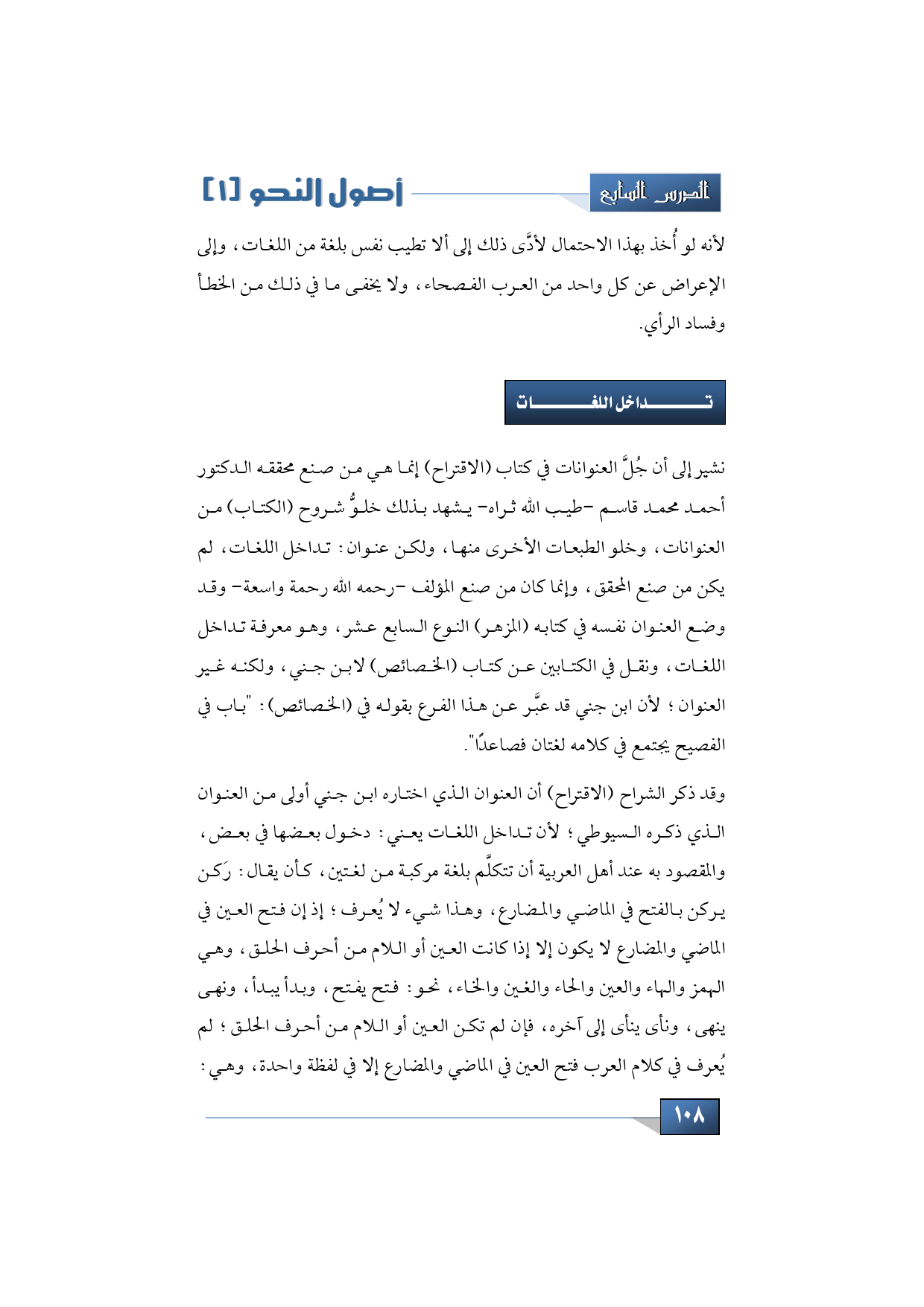 نشير إلى أن جُلَّ العنوانات في كتاب (الاقتراح) إنما هي من صنع محققه الدكتور أحمد محمد قاسم -طيب الله ثراه- يشهد بذلك خلوُّ شروح (الكتاب) من العنوانات، وخلو الطبعات الأخرى منها، ولكن عنوان: تداخل اللغات، لم يكن من صنع المحقق، وإنما كان من صنع المؤلف -رحمه الله رحمة واسعة- وقد وضع العنوان نفسه في كتابه (المزهر) النوع السابع عشر، وهو معرفة تداخل اللغات، ونقل في الكتابين عن كتاب (الخصائص) لابن جني، ولكنه غير العنوان؛ لأن ابن جني قد عبَّر عن هذا الفرع بقوله في (الخصائص): "باب في الفصيح يجتمع في كلامه لغتان فصاعدًا".