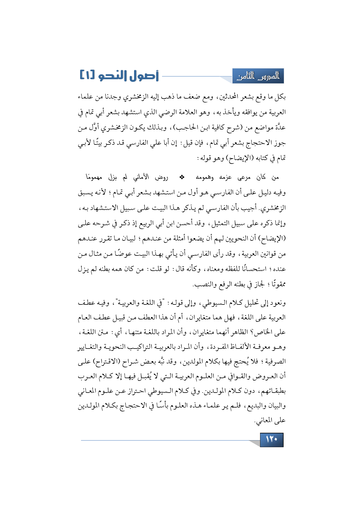 ونعود إلى تحليل كلام السيوطي، وإلى قوله: "في اللغة والعربية"، وفيه عطف العربية على اللغة، فهل هما متغايران، أم أن هذا العطف من قبيل عطف العام على الخاص؟ الظاهر أنهما متغايران، وأن المراد باللغة متنها، أي: متن اللغة، وهو معرفة الألفاظ المفردة، وأن المراد بالعربية التراكيب النحوية والتغايير الصرفية؛ فلا يُحتج فيها بكلام المولدين، وقد نبَّه بعض شراح (الاقتراح) على أن العروض والقوافي من العلوم العربية التي لا يُقبل فيها إلا كلام العرب بطبقاتهم، دون كلام المولدين. وفي كلام السيوطي احتراز عن علوم المعاني والبيان والبديع، فلم ير علماء هذه العلوم بأسًا في الاحتجاج بكلام المولدين على المعاني.