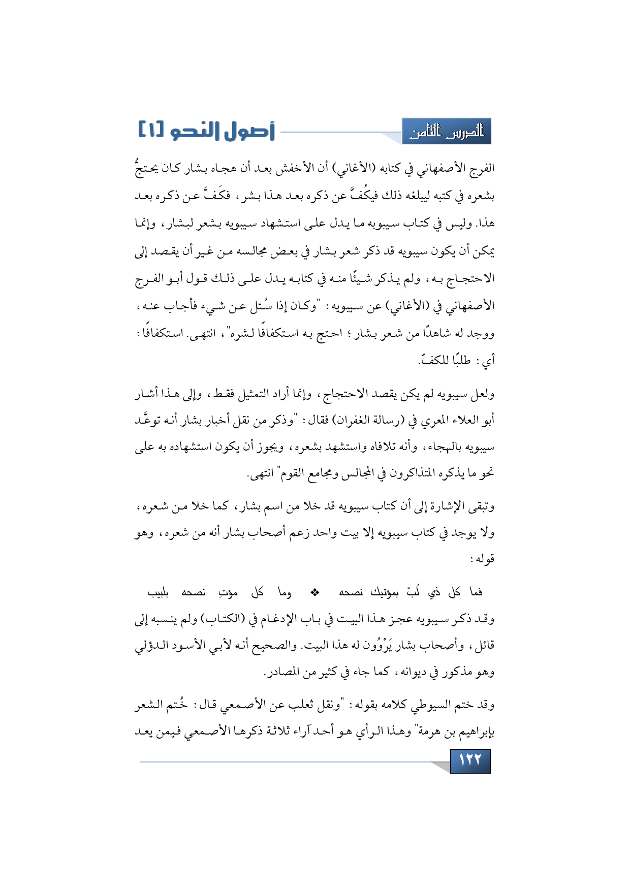 الفرج الأصفهاني في كتابه (الأغاني) أن الأخفش بعد أن هجاه بشار كان يحتجُّ بشعره في كتبه ليبلغه ذلك فيكُفَّ عن ذكره بعد هذا بشر، فكَفَّ عن ذكره بعد هذا. وليس في كتاب سيبوبه ما يدل على استشهاد سيبويه بشعر لبشار، وإنما يمكن أن يكون سيبويه قد ذكر شعر بشار في بعض مجالسه من غير أن يقصد إلى الاحتجاج به، ولم يذكر شيئًا منه في كتابه يدل على ذلك قول أبو الفرج الأصفهاني في (الأغاني) عن سيبويه: "وكان إذا سُئل عن شيء فأجاب عنه، ووجد له شاهدًا من شعر بشار؛ احتج به استكفافًا لشره"، انتهى. استكفافًا: أي: طلبًا للكفّ.
