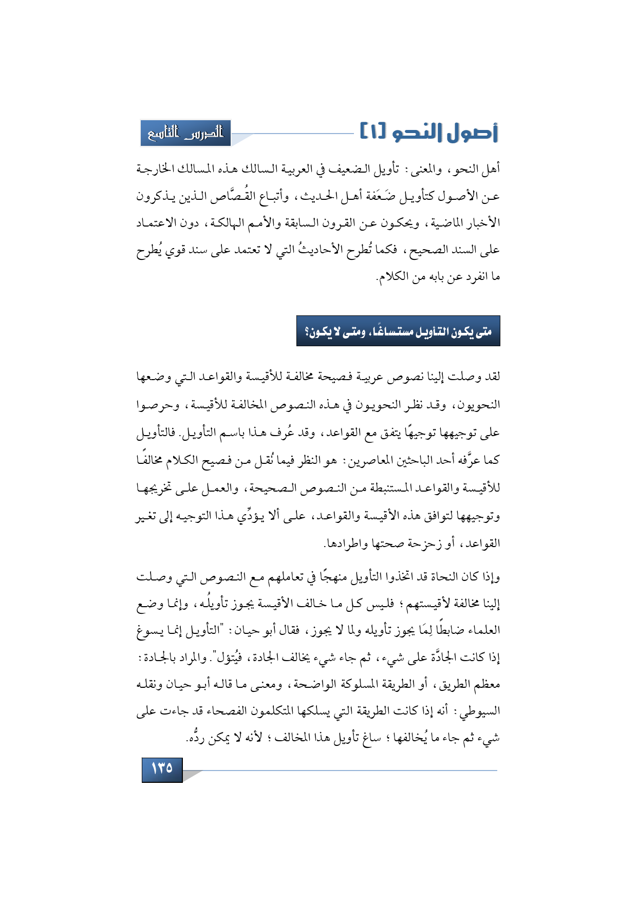 وإذا كان النحاة قد اتخذوا التأويل منهجًا في تعاملهم مع النصوص التي وصلت إلينا مخالفة لأقيستهم؛ فليس كل ما خالف الأقيسة يجوز تأويلُه، وإنما وضع العلماء ضابطًا لِمَا يجوز تأويله ولما لا يجوز، فقال أبو حيان: "التأويل إنما يسوغ إذا كانت الجادَّة على شيء، ثم جاء شيء يخالف الجادة، فيُتؤل". والمراد بالجادة: معظم الطريق، أو الطريقة المسلوكة الواضحة، ومعنى ما قاله أبو حيان ونقله السيوطي: أنه إذا كانت الطريقة التي يسلكها المتكلمون الفصحاء قد جاءت على شيء ثم جاء ما يُخالفها؛ ساغ تأويل هذا المخالف؛ لأنه لا يمكن ردُّه.