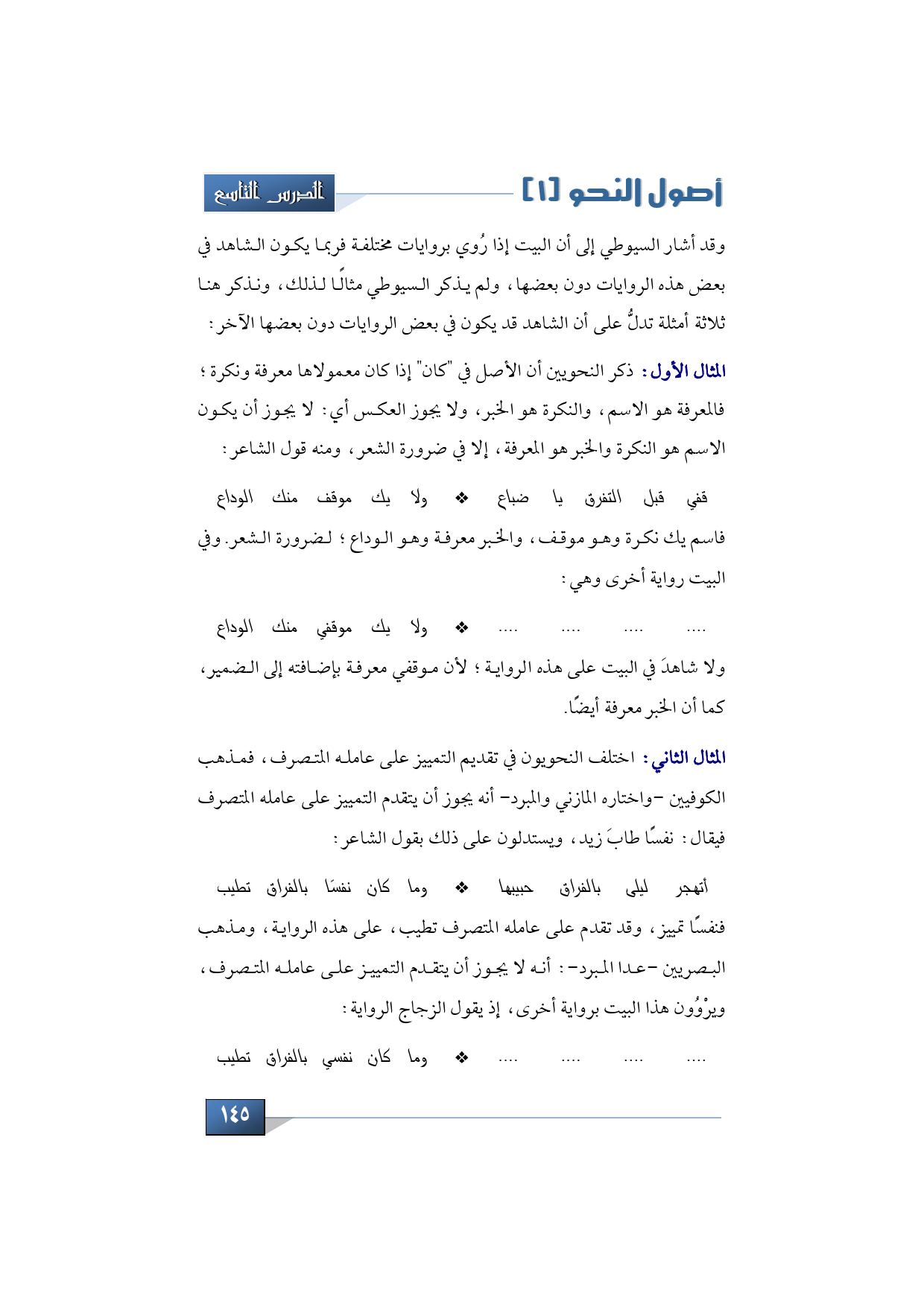 المثال الأول: ذكر النحويين أن الأصل في "كان" إذا كان معمولاها معرفة ونكرة؛ فالمعرفة هو الاسم، والنكرة هو الخبر، ولا يجوز العكس أي: لا يجوز أن يكون الاسم هو النكرة والخبر هو المعرفة، إلا في ضرورة الشعر، ومنه قول الشاعر: