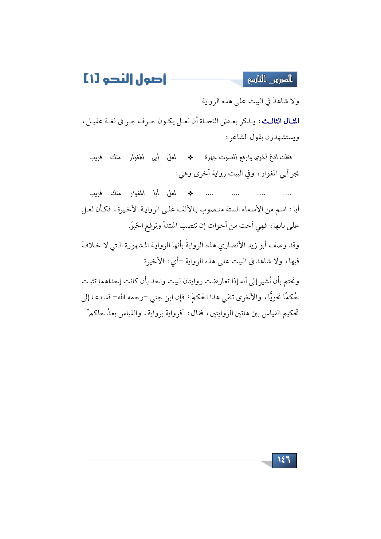 وقد وصف أبو زيد الأنصاري هذه الروايةَ بأنها الرواية المشهورة التي لا خلافَ فيها، ولا شاهد في البيت على هذه الرواية -أي: الأخيرة-.