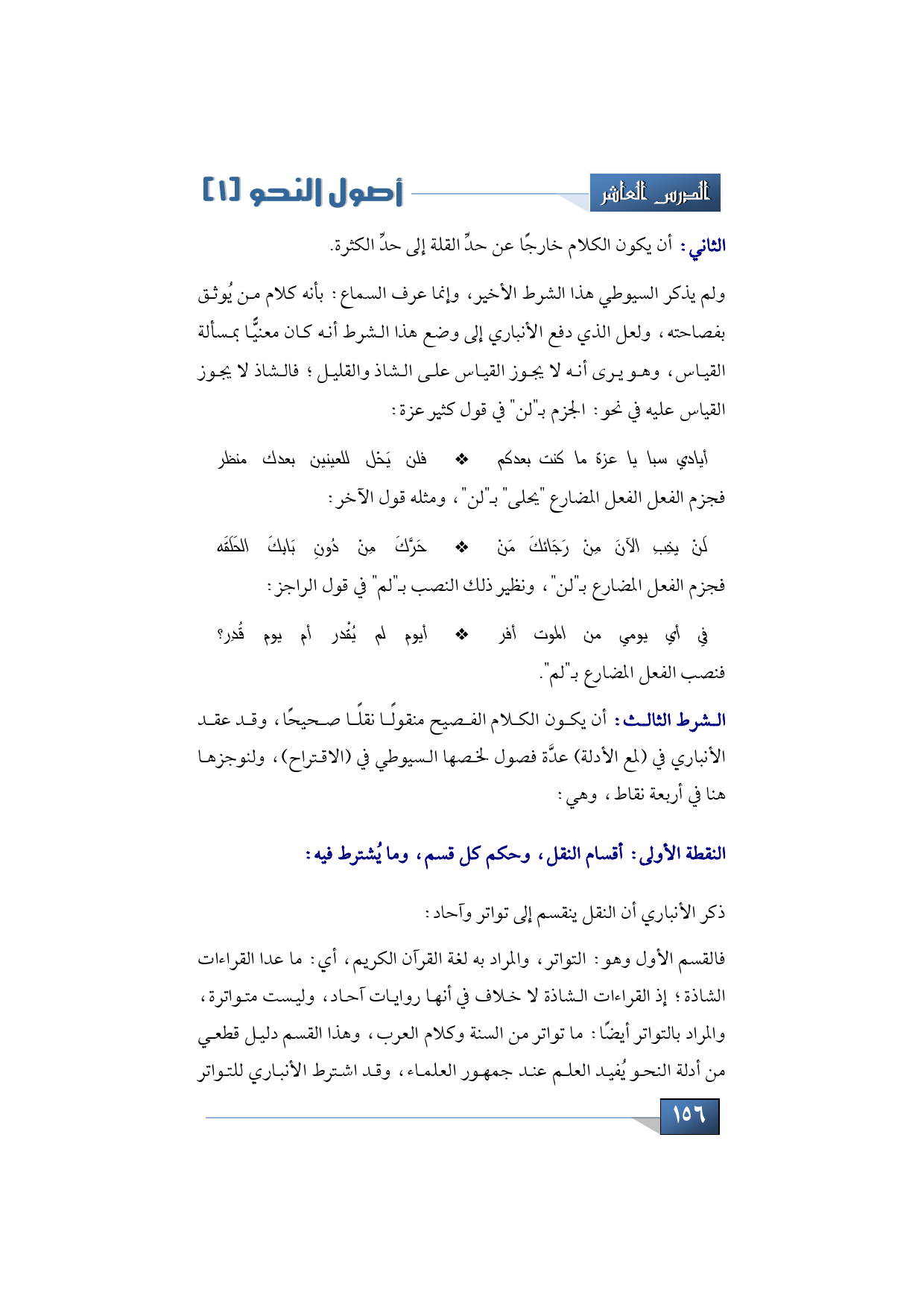 ولم يذكر السيوطي هذا الشرط الأخير، وإنما عرف السماع: بأنه كلام من يُوثق بفصاحته، ولعل الذي دفع الأنباري إلى وضع هذا الشرط أنه كان معنيًّا بمسألة القياس، وهو يرى أنه لا يجوز القياس على الشاذ والقليل؛ فالشاذ لا يجوز القياس عليه في نحو: الجزم بـ"لن" في قول كثير عزة: