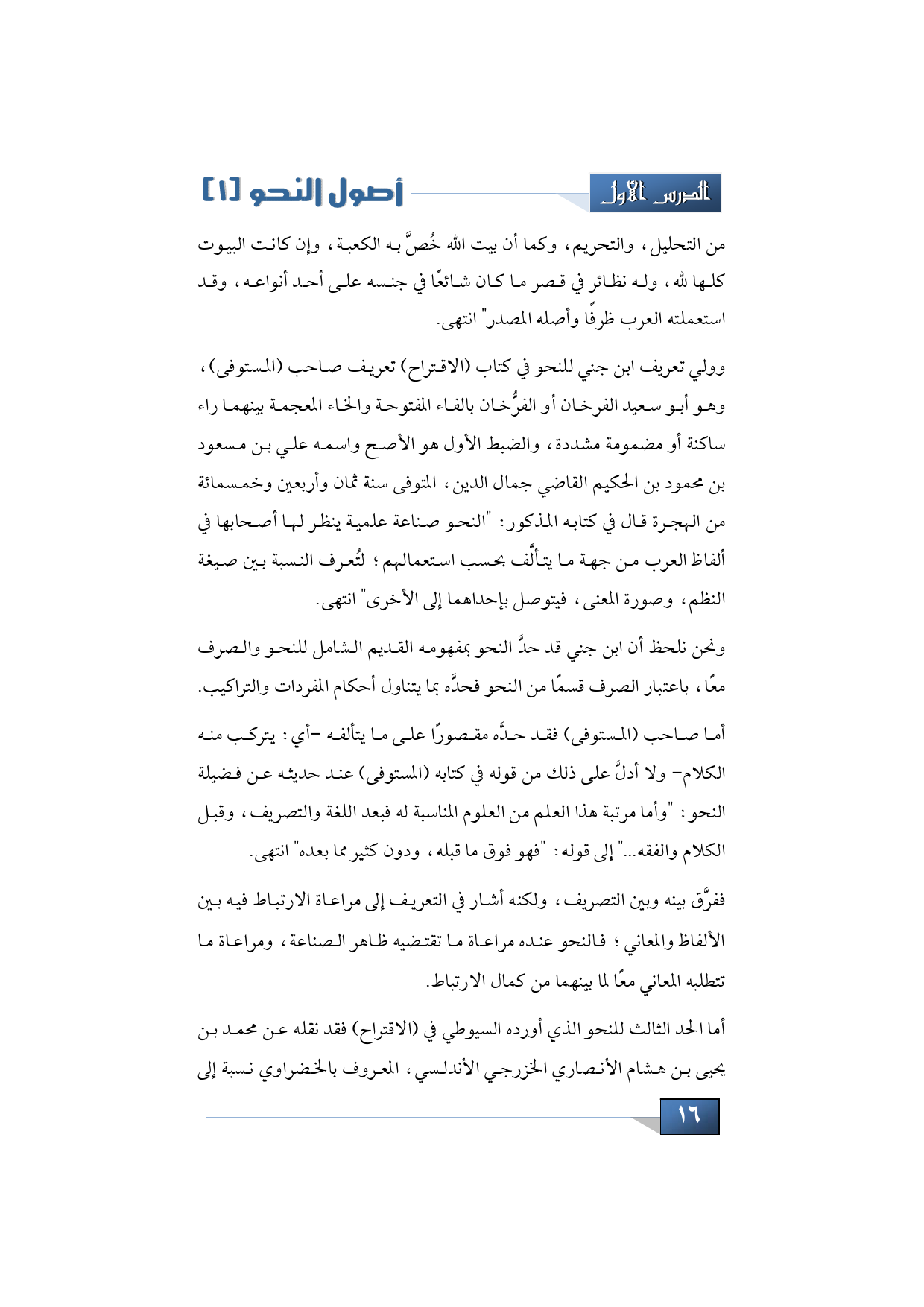 ونحن نلحظ أن ابن جني قد حدَّ النحو بمفهومه القديم الشامل للنحو والصرف معًا، باعتبار الصرف قسمًا من النحو فحدَّه بما يتناول أحكام المفردات والتراكيب.