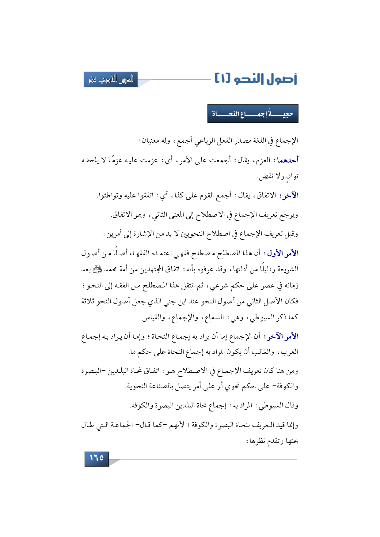 ومن هنا كان تعريف الإجماع في الاصطلاح هو: اتفاق نحاة البلدين -البصرة والكوفة- على حكم نحوي أو على أمر يتصل بالصناعة النحوية.
