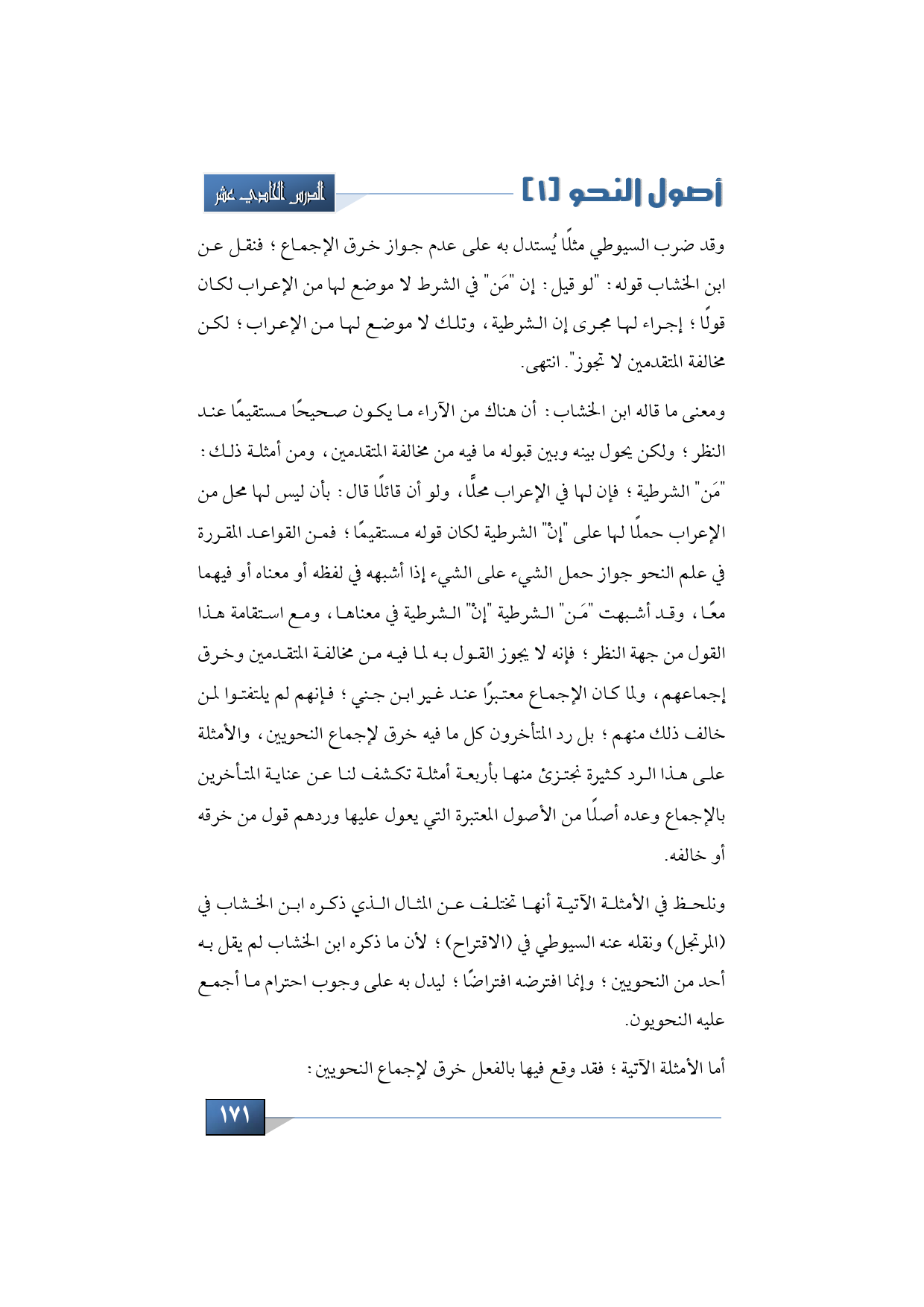 ومعنى ما قاله ابن الخشاب: أن هناك من الآراء ما يكون صحيحًا مستقيمًا عند النظر؛ ولكن يحول بينه وبين قبوله ما فيه من مخالفة المتقدمين، ومن أمثلة ذلك: "مَن" الشرطية؛ فإن لها في الإعراب محلًّا، ولو أن قائلًا قال: بأن ليس لها محل من الإعراب حملًا لها على "إنْ" الشرطية لكان قوله مستقيمًا؛ فمن القواعد المقررة في علم النحو جواز حمل الشيء على الشيء إذا أشبهه في لفظه أو معناه أو فيهما معًا، وقد أشبهت "مَن" الشرطية "إنْ" الشرطية في معناها، ومع استقامة هذا القول من جهة النظر؛ فإنه لا يجوز القول به لما فيه من مخالفة المتقدمين وخرق إجماعهم، ولما كان الإجماع معتبرًا عند غير ابن جني؛ فإنهم لم يلتفتوا لمن خالف ذلك منهم؛ بل رد المتأخرون كل ما فيه خرق لإجماع النحويين، والأمثلة على هذا الرد كثيرة نجتزئ منها بأربعة أمثلة تكشف لنا عن عناية المتأخرين بالإجماع وعده أصلًا من الأصول المعتبرة التي يعول عليها وردهم قول من خرقه أو خالفه.