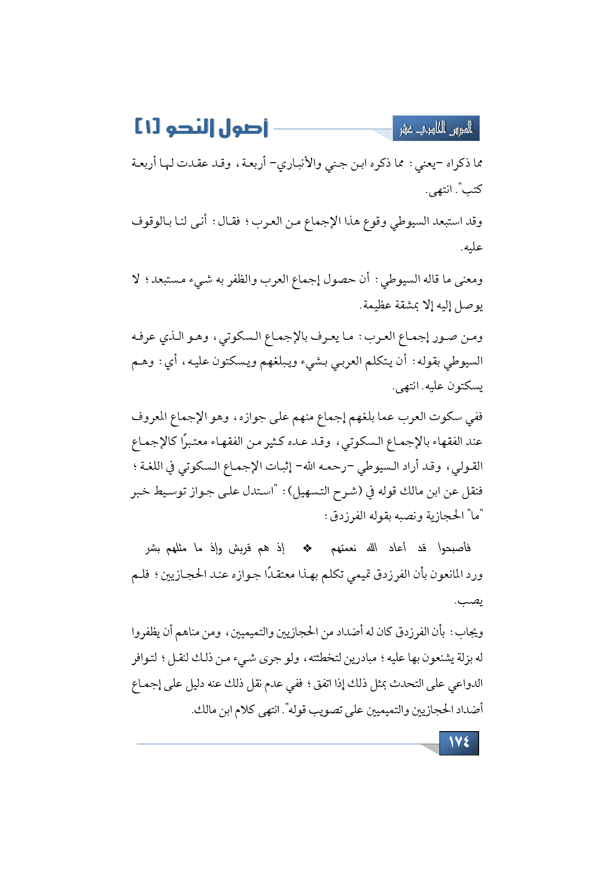 ويجاب: بأن الفرزدق كان له أضداد من الحجازيين والتميميين، ومن مناهم أن يظفروا له بزلة يشنعون بها عليه؛ مبادرين لتخطئته، ولو جرى شيء من ذلك لنقل؛ لتوافر الدواعي على التحدث بمثل ذلك إذا اتفق؛ ففي عدم نقل ذلك عنه دليل على إجماع أضداد الحجازيين والتميميين على تصويب قوله". انتهى كلام ابن مالك.