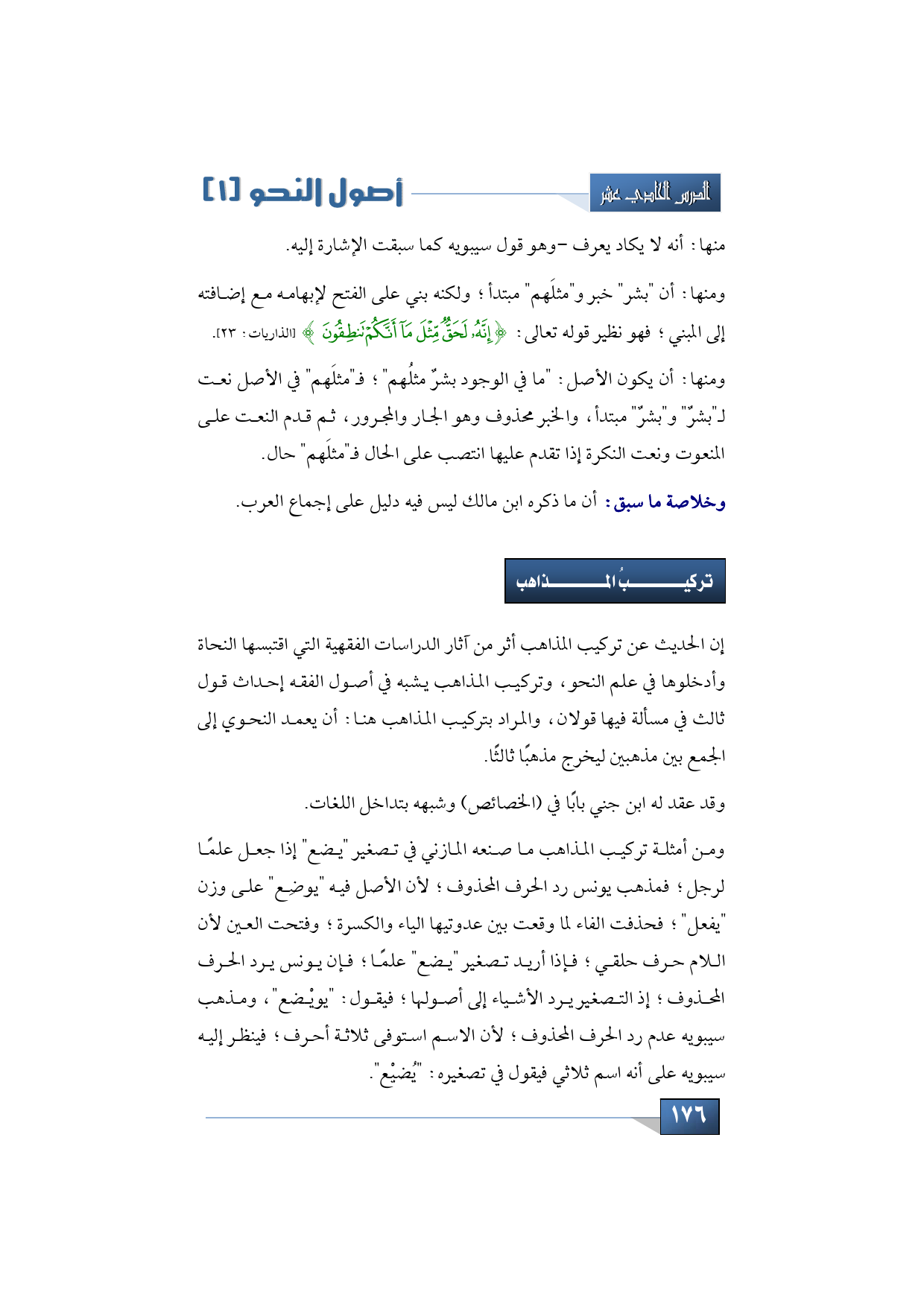 ومن أمثلة تركيب المذاهب ما صنعه المازني في تصغير "يضع" إذا جعل علمًا لرجل؛ فمذهب يونس رد الحرف المحذوف؛ لأن الأصل فيه "يوضِع" على وزن "يفعل"؛ فحذفت الفاء لما وقعت بين عدوتيها الياء والكسرة؛ وفتحت العين لأن اللام حرف حلقي؛ فإذا أريد تصغير "يضع" علمًا؛ فإن يونس يرد الحرف المحذوف؛ إذ التصغير يرد الأشياء إلى أصولها؛ فيقول: "يويْضع"، ومذهب سيبويه عدم رد الحرف المحذوف؛ لأن الاسم استوفى ثلاثة أحرف؛ فينظر إليه سيبويه على أنه اسم ثلاثي فيقول في تصغيره: "يُضيْع".