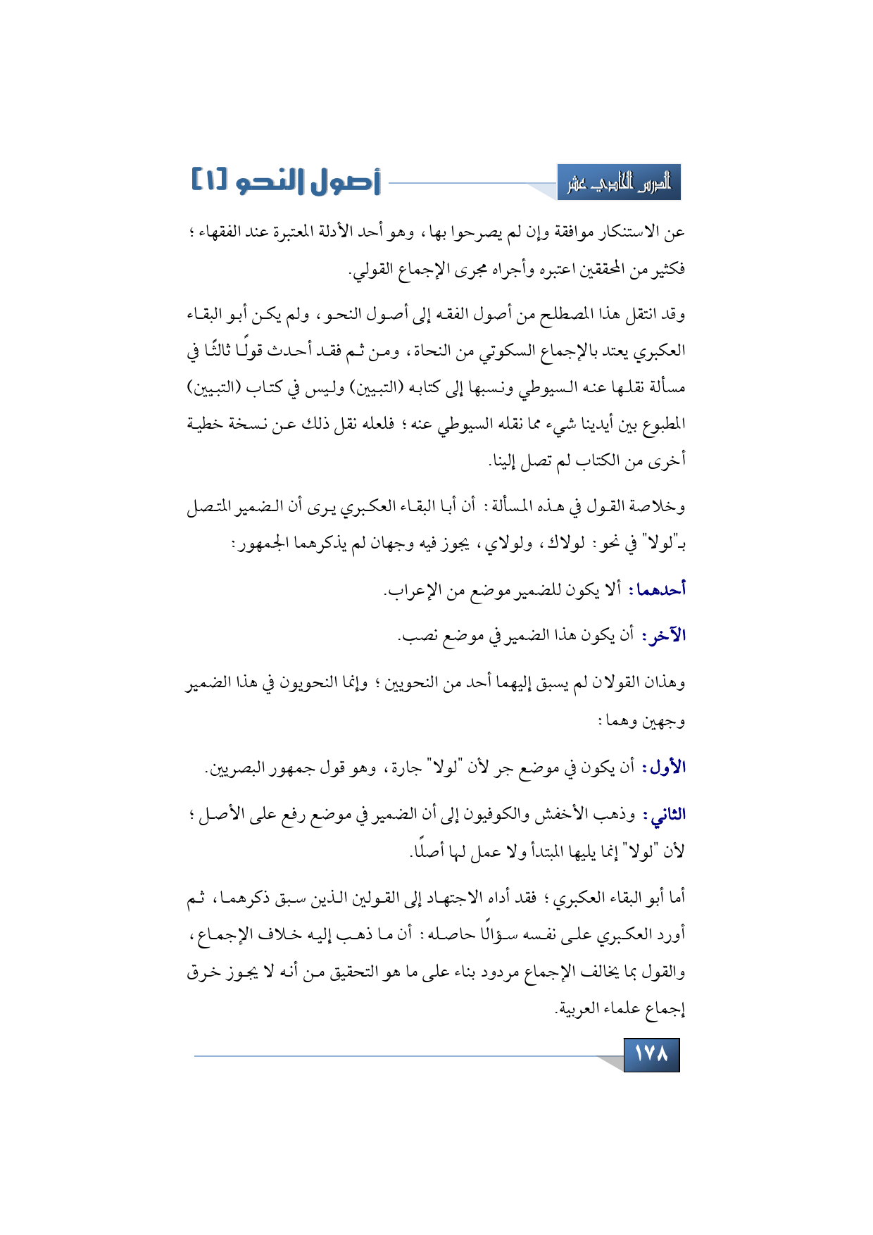 وقد انتقل هذا المصطلح من أصول الفقه إلى أصول النحو، ولم يكن أبو البقاء العكبري يعتد بالإجماع السكوتي من النحاة، ومن ثم فقد أحدث قولًا ثالثًا في مسألة نقلها عنه السيوطي ونسبها إلى كتابه (التبيين) وليس في كتاب (التبيين) المطبوع بين أيدينا شيء مما نقله السيوطي عنه؛ فلعله نقل ذلك عن نسخة خطية أخرى من الكتاب لم تصل إلينا.
