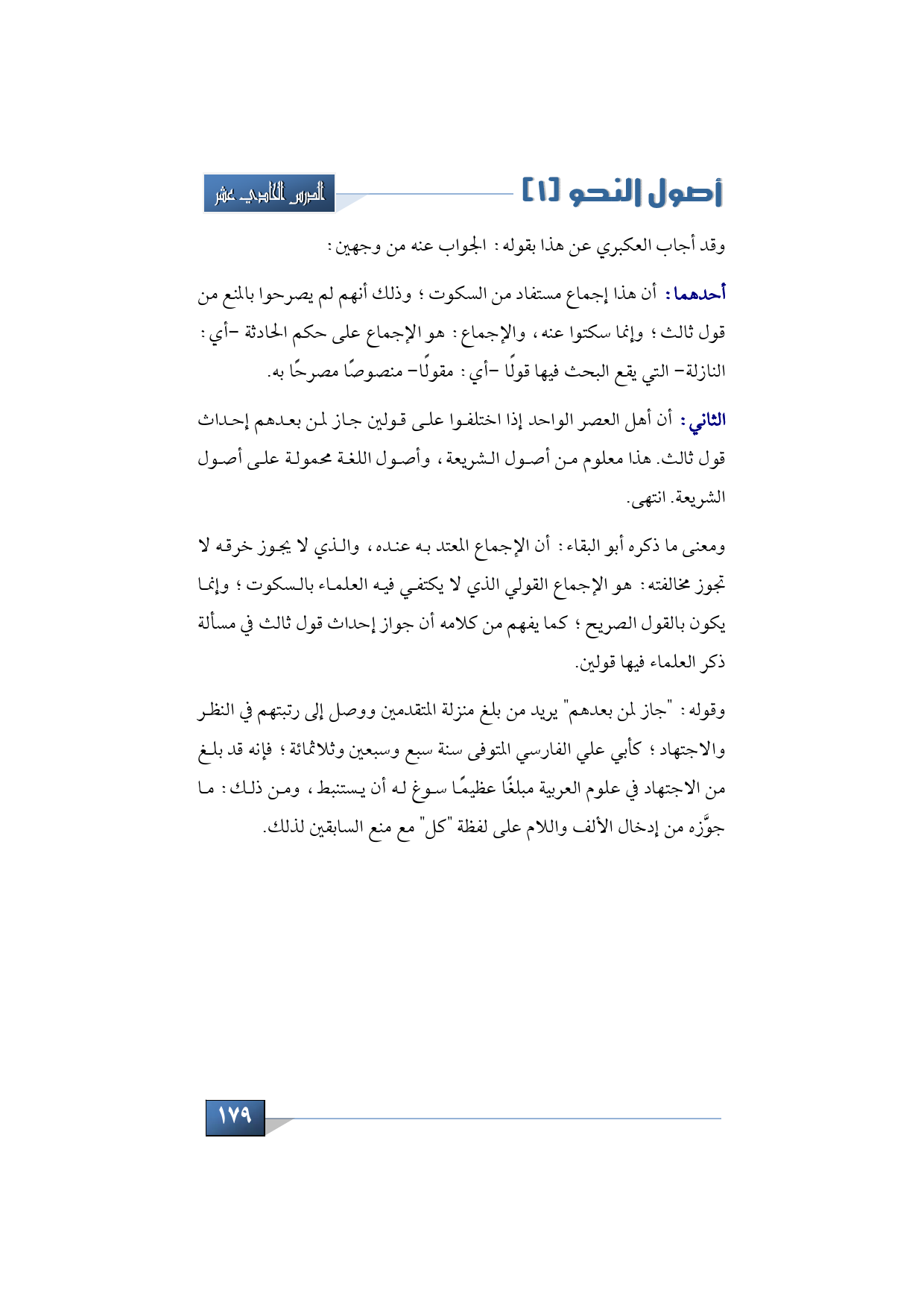 والثاني: أن أهل العصر الواحد إذا اختلفوا على قولين جاز لمن بعدهم إحداث قول ثالث. هذا معلوم من أصول الشريعة، وأصول اللغة محمولة على أصول الشريعة. انتهى.