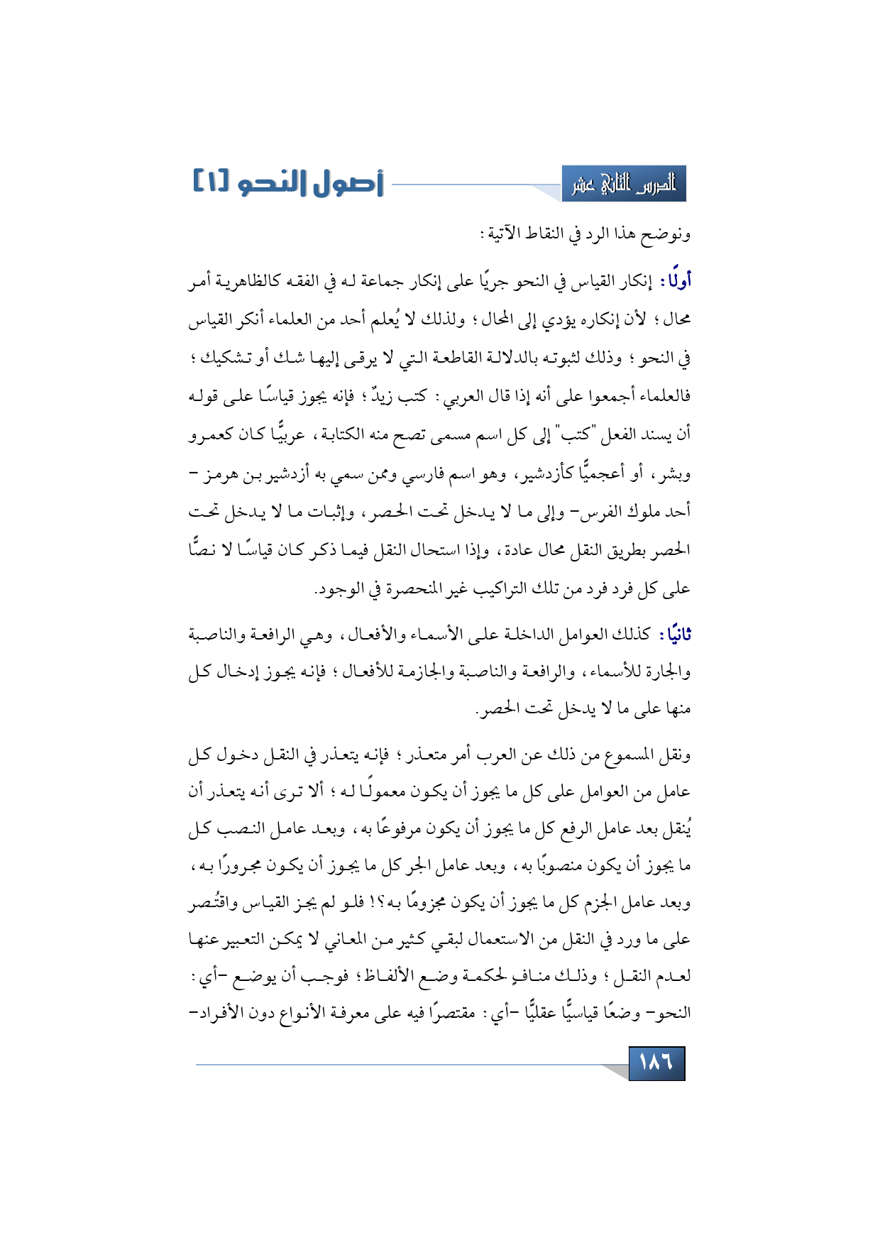 أولًا: إنكار القياس في النحو جريًا على إنكار جماعة له في الفقه كالظاهرية أمر محال؛ لأن إنكاره يؤدي إلى المحال؛ ولذلك لا يُعلم أحد من العلماء أنكر القياس في النحو؛ وذلك لثبوته بالدلالة القاطعة التي لا يرقى إليها شك أو تشكيك؛ فالعلماء أجمعوا على أنه إذا قال العربي: كتب زيدٌ؛ فإنه يجوز قياسًا على قوله أن يسند الفعل "كتب" إلى كل اسم مسمى تصح منه الكتابة، عربيًّا كان كعمرو وبشر، أو أعجميًّا كأزدشير، وهو اسم فارسي وممن سمي به أزدشير بن هرمز -أحد ملوك الفرس- وإلى ما لا يدخل تحت الحصر، وإثبات ما لا يدخل تحت الحصر بطريق النقل محال عادة، وإذا استحال النقل فيما ذكر كان قياسًا لا نصًّا على كل فرد فرد من تلك التراكيب غير المنحصرة في الوجود.