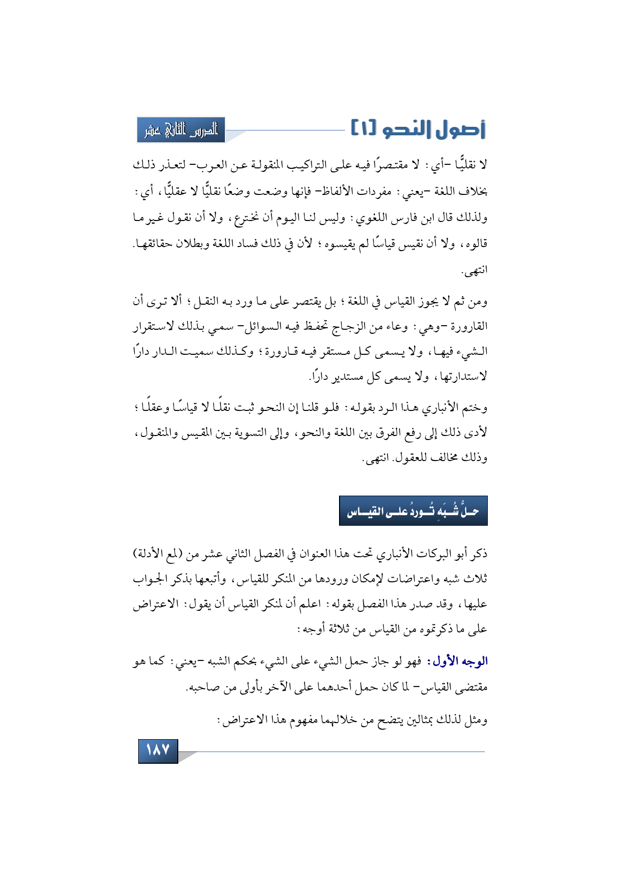 وختم الأنباري هذا الرد بقوله: فلو قلنا إن النحو ثبت نقلًا لا قياسًا وعقلًا؛ لأدى ذلك إلى رفع الفرق بين اللغة والنحو، وإلى التسوية بين المقيس والمنقول، وذلك مخالف للعقول. انتهى.