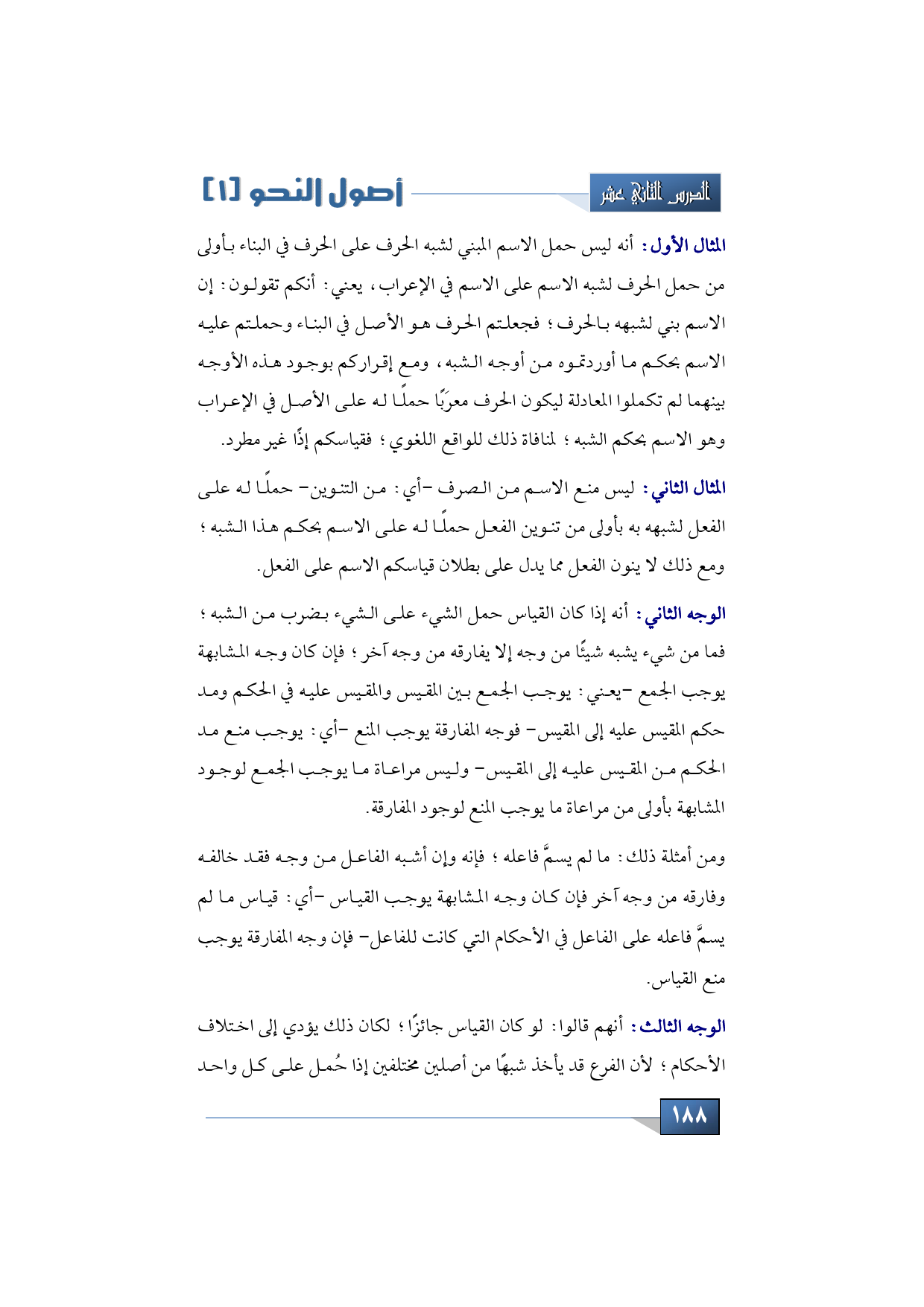 ومن أمثلة ذلك: ما لم يسمَّ فاعله؛ فإنه وإن أشبه الفاعل من وجه فقد خالفه وفارقه من وجه آخر فإن كان وجه المشابهة يوجب القياس -أي: قياس ما لم يسمَّ فاعله على الفاعل في الأحكام التي كانت للفاعل- فإن وجه المفارقة يوجب منع القياس.