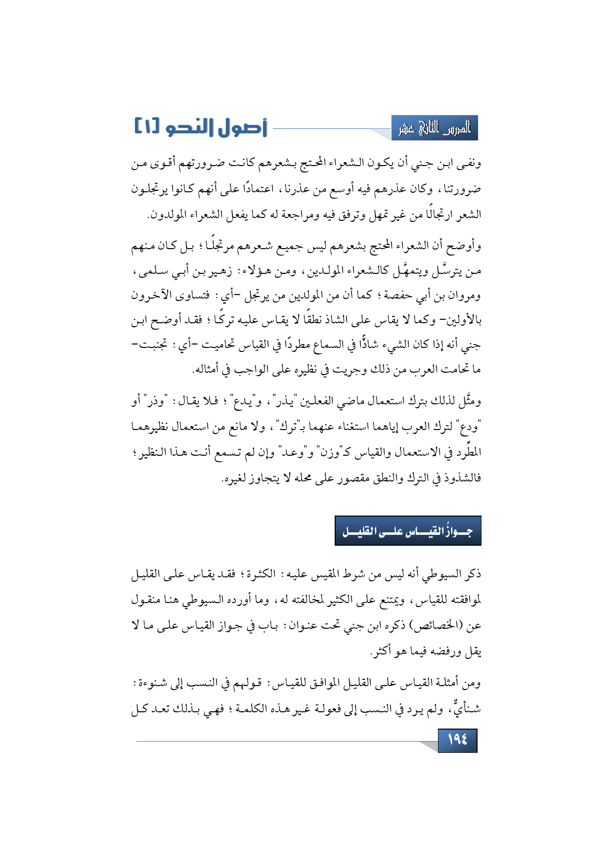 وأوضح أن الشعراء المحتج بشعرهم ليس جميع شعرهم مرتجلًا؛ بل كان منهم من يترسَّل ويتمهَّل كالشعراء المولدين، ومن هؤلاء: زهير بن أبي سلمى، ومروان بن أبي حفصة؛ كما أن من المولدين من يرتجل -أي: فتساوى الآخرون بالأولين- وكما لا يقاس على الشاذ نطقًا لا يقاس عليه تركًا؛ فقد أوضح ابن جني أنه إذا كان الشيء شاذًّا في السماع مطردًا في القياس تحاميت -أي: تجنبت- ما تحامت العرب من ذلك وجريت في نظيره على الواجب في أمثاله.