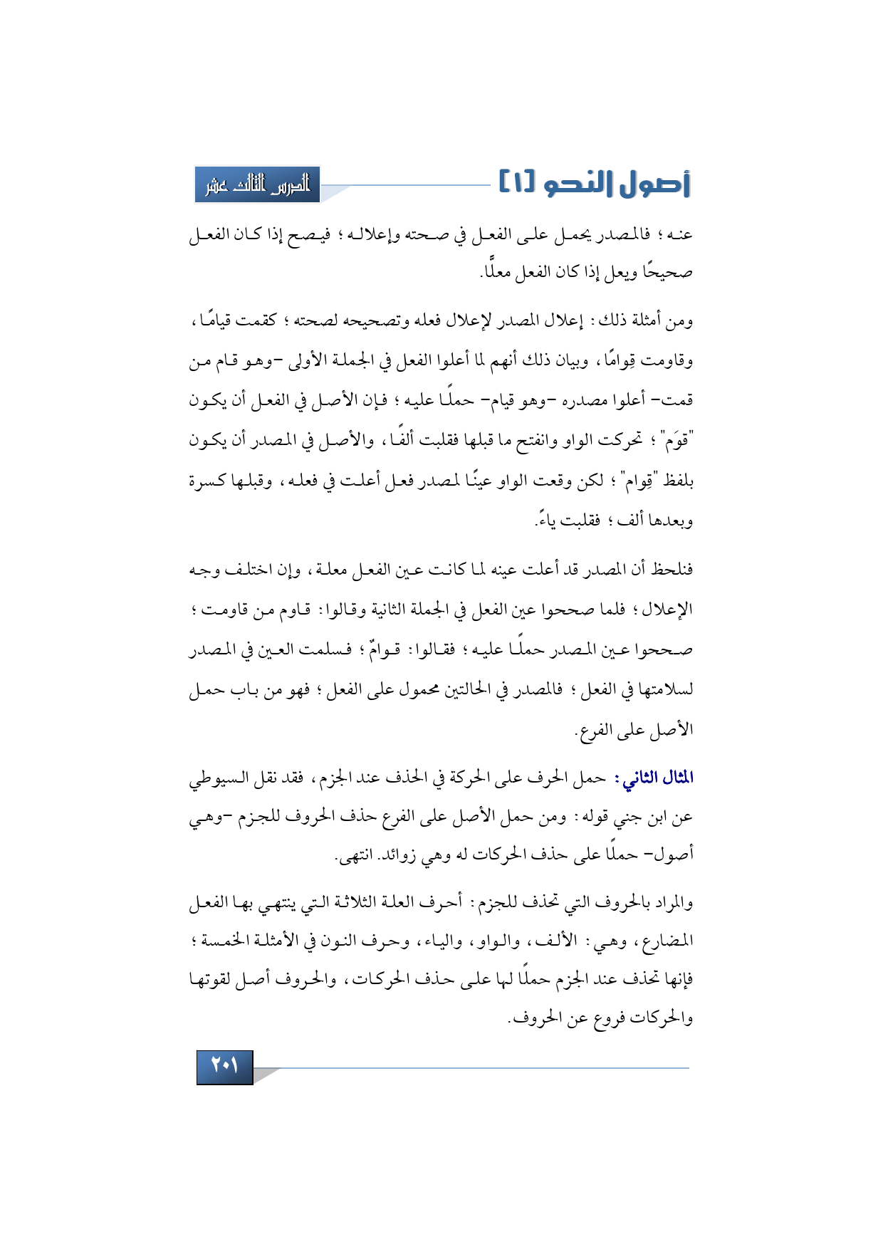 ومن أمثلة ذلك: إعلال المصدر لإعلال فعله وتصحيحه لصحته؛ كقمت قيامًا، وقاومت قِوامًا، وبيان ذلك أنهم لما أعلوا الفعل في الجملة الأولى -وهو قام من قمت- أعلوا مصدره -وهو قيام- حملًا عليه؛ فإن الأصل في الفعل أن يكون "قوَم"؛ تحركت الواو وانفتح ما قبلها فقلبت ألفًا، والأصل في المصدر أن يكون بلفظ "قِوام"؛ لكن وقعت الواو عينًا لمصدر فعل أعلت في فعله، وقبلها كسرة وبعدها ألف؛ فقلبت ياءً.