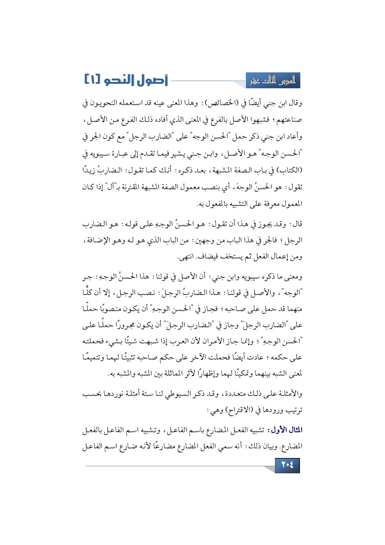 وقال ابن جني أيضًا في (الخصائص): وهذا المعنى عينه قد استعمله النحويون في صناعتهم؛ فشبهوا الأصل بالفرع في المعنى الذي أفاده ذلك الفرع من الأصل، وأعاد ابن جني ذكر حمل "الحسن الوجه" على "الضارب الرجل" مع كون الجر في "الحسن الوجه" هو الأصل، وابن جني يشير فيما تقدم إلى عبارة سيبويه في (الكتاب) في باب الصفة المشبهة، بعد ذكره: أنك كما تقول: الضاربُ زيدًا تقول: هو الحسنُ الوجهَ، أي بنصب معمول الصفة المشبهة المقترنة بـ"أل" إذا كان المعمول معرفة على التشبيه بالمفعول به.