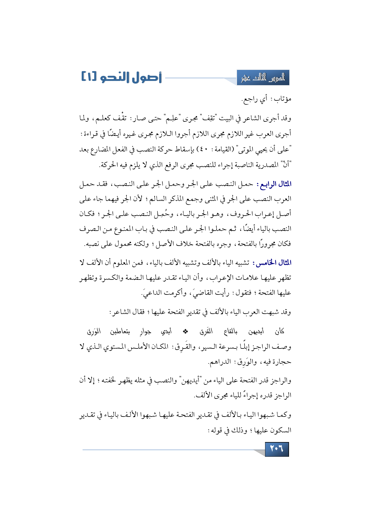 وقد أجرى الشاعر في البيت "تقِف" مجرى "علِم" حتى صار: تقْف كعلم، ولما أجرى العرب غير اللازم مجرى اللازم أجروا اللازم مجرى غيره أيضًا في قراءة: "على أن يحيِي الموتى" (القيامة: 40) بإسقاط حركة النصب في الفعل المضارع بعد "أنْ" المصدرية الناصبة إجراء للنصب مجرى الرفع الذي لا يلزم فيه الحركة.