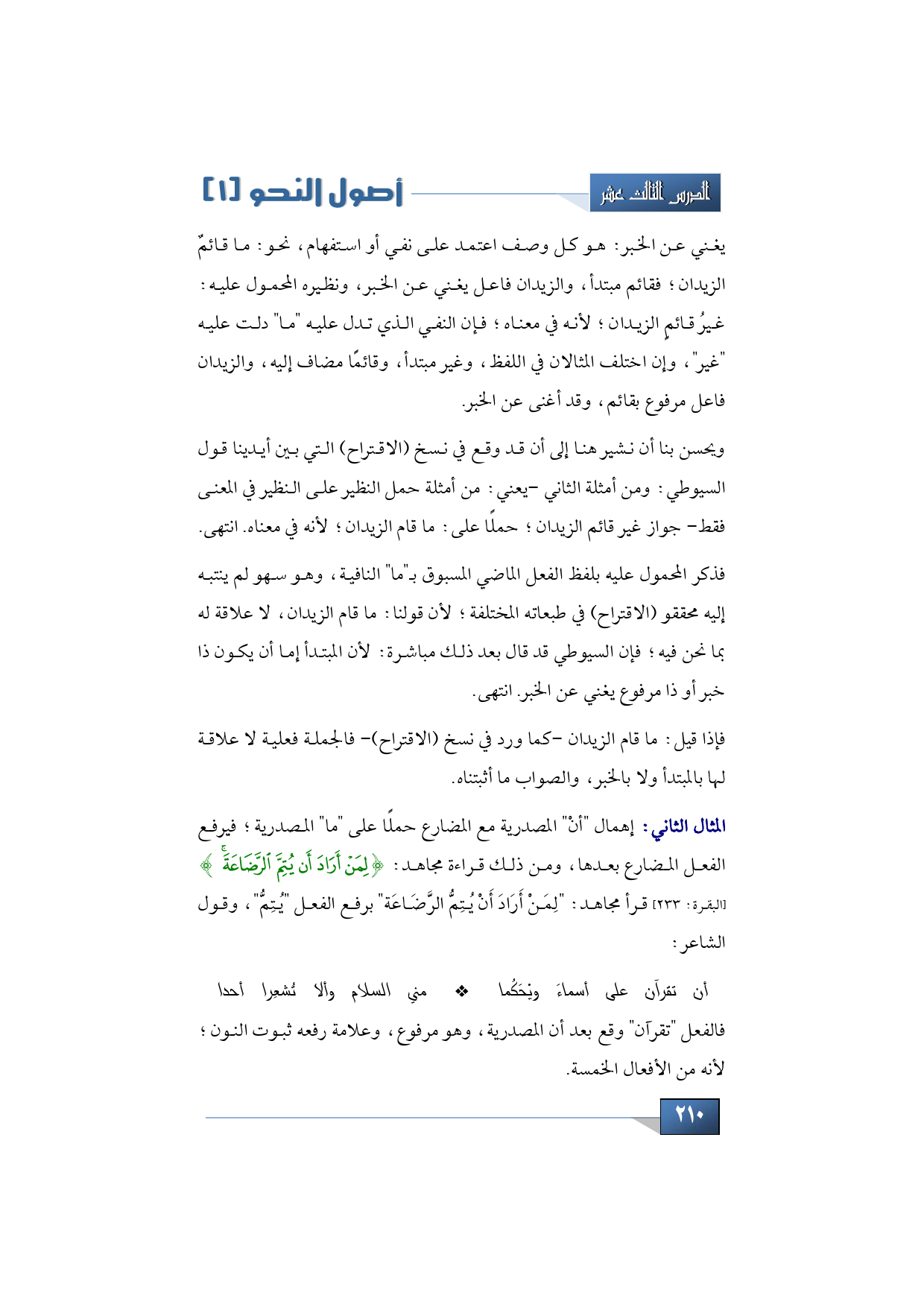 فذكر المحمول عليه بلفظ الفعل الماضي المسبوق بـ"ما" النافية، وهو سهو لم ينتبه إليه محققو (الاقتراح) في طبعاته المختلفة؛ لأن قولنا: ما قام الزيدان، لا علاقة له بما نحن فيه؛ فإن السيوطي قد قال بعد ذلك مباشرة: لأن المبتدأ إما أن يكون ذا خبر أو ذا مرفوع يغني عن الخبر. انتهى.