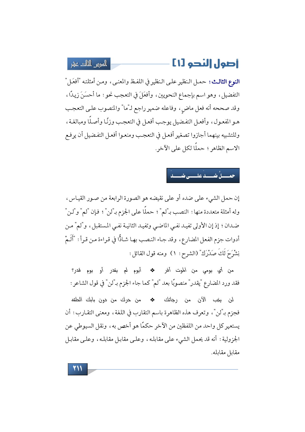 ثالثًا: حمل النظير على النظير في اللفظ والمعنى، ومن أمثلته "أفعَل" التفضيل، وهو اسم بإجماع النحويين، وأفعَلَ في التعجب نحو: ما أحسَنَ زيدًا، وقد صححه أنه فعل ماضٍ، وفاعله ضمير راجع لـ"ما" والمنصوب على التعجب هو المفعول، وأفعل التفضيل يوجب أفعل في التعجب وزنًا وأصلًا ومبالغة، وللتشبيه بينهما أجازوا تصغير أفعل في التعجب ومنعوا أفعل التفضيل أن يرفع الاسم الظاهر؛ حملًا لكل على الآخر.