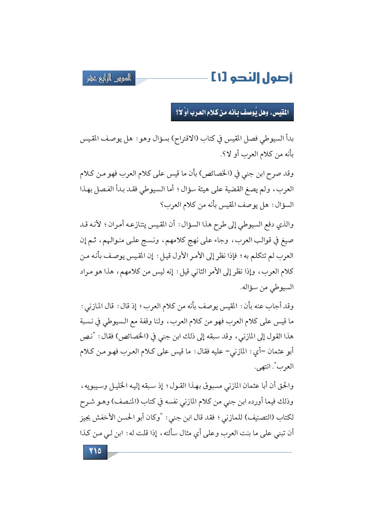 وقد أجاب عنه بأن: المقيس يوصف بأنه من كلام العرب؛ إذ قال: قال المازني: ما قيس على كلام العرب فهو من كلام العرب، ولنا وقفة مع السيوطي في نسبة هذا القول إلى المازني، وقد سبقه إلى ذلك ابن جني في (الخصائص) فقال: "نص أبو عثمان -أي: المازني- عليه فقال: ما قيس على كلام العرب فهو من كلام العرب". انتهى.