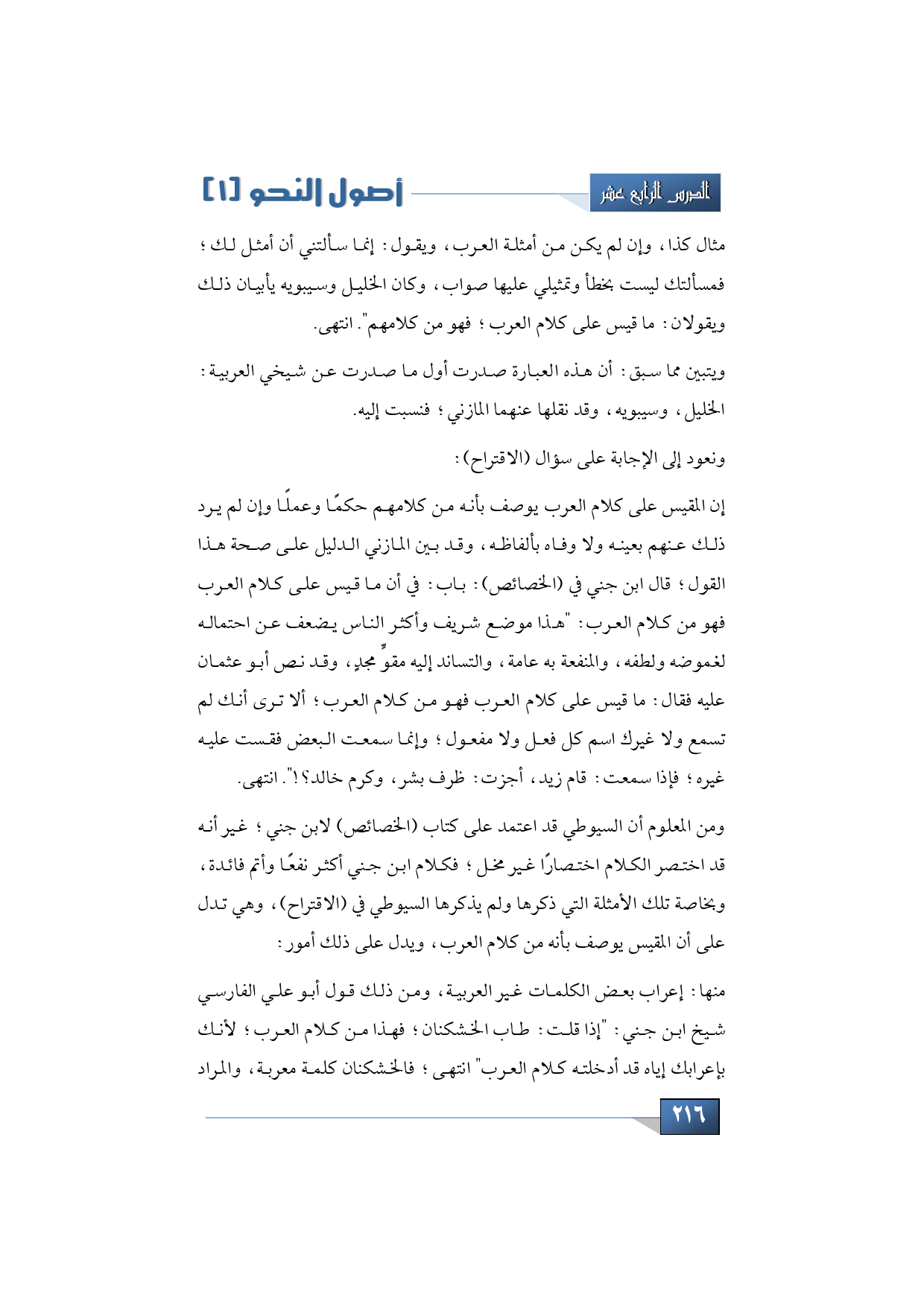 ومن المعلوم أن السيوطي قد اعتمد على كتاب (الخصائص) لابن جني؛ غير أنه قد اختصر الكلام اختصارًا غير مخل؛ فكلام ابن جني أكثر نفعًا وأتم فائدة، وبخاصة تلك الأمثلة التي ذكرها ولم يذكرها السيوطي في (الاقتراح)، وهي تدل على أن المقيس يوصف بأنه من كلام العرب، ويدل على ذلك أمور: