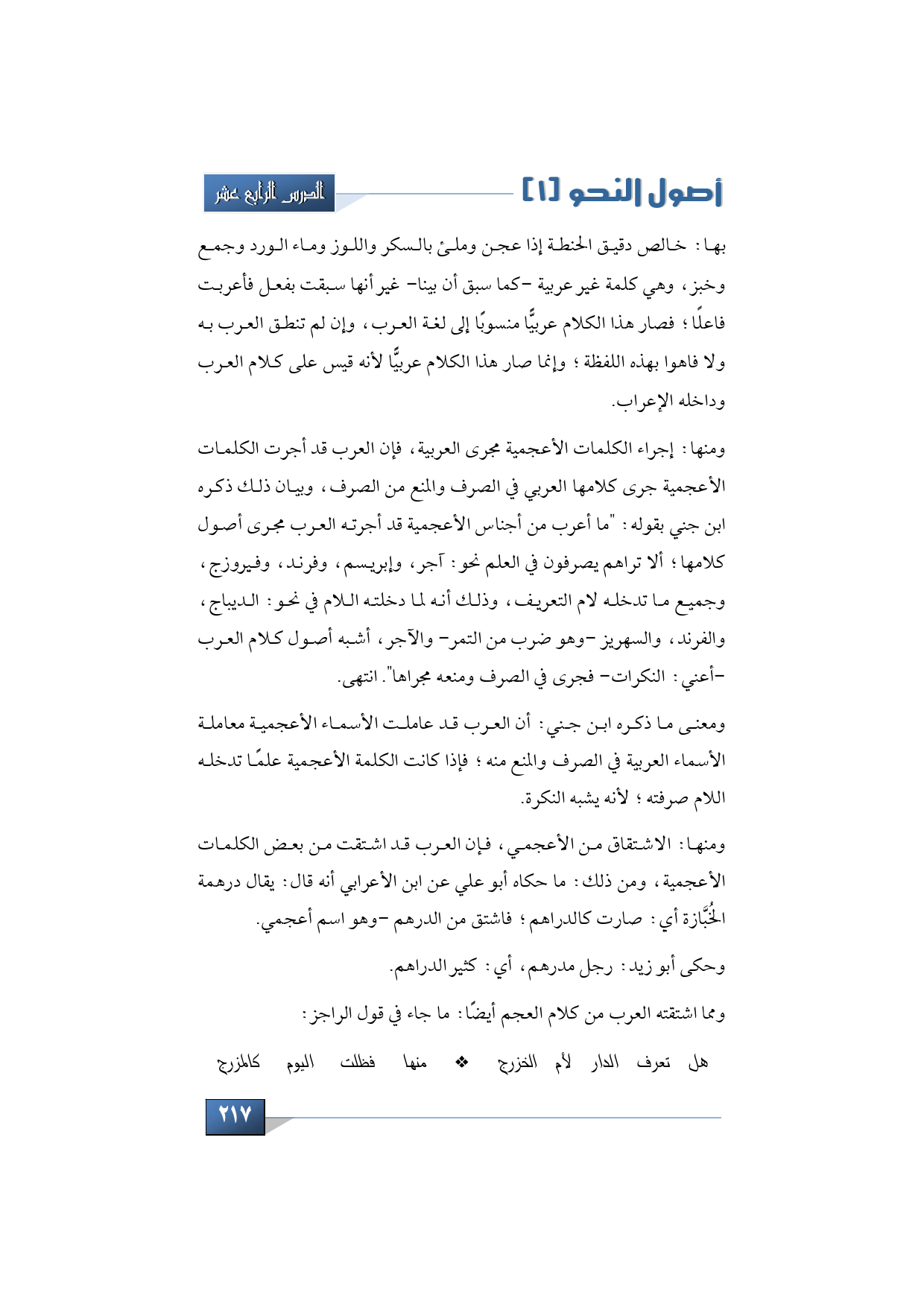 ومنها: الاشتقاق من الأعجمي، فإن العرب قد اشتقت من بعض الكلمات الأعجمية، ومن ذلك: ما حكاه أبو علي عن ابن الأعرابي أنه قال: يقال درهمة الخُبَّازة أي: صارت كالدراهم؛ فاشتق من الدرهم -وهو اسم أعجمي.