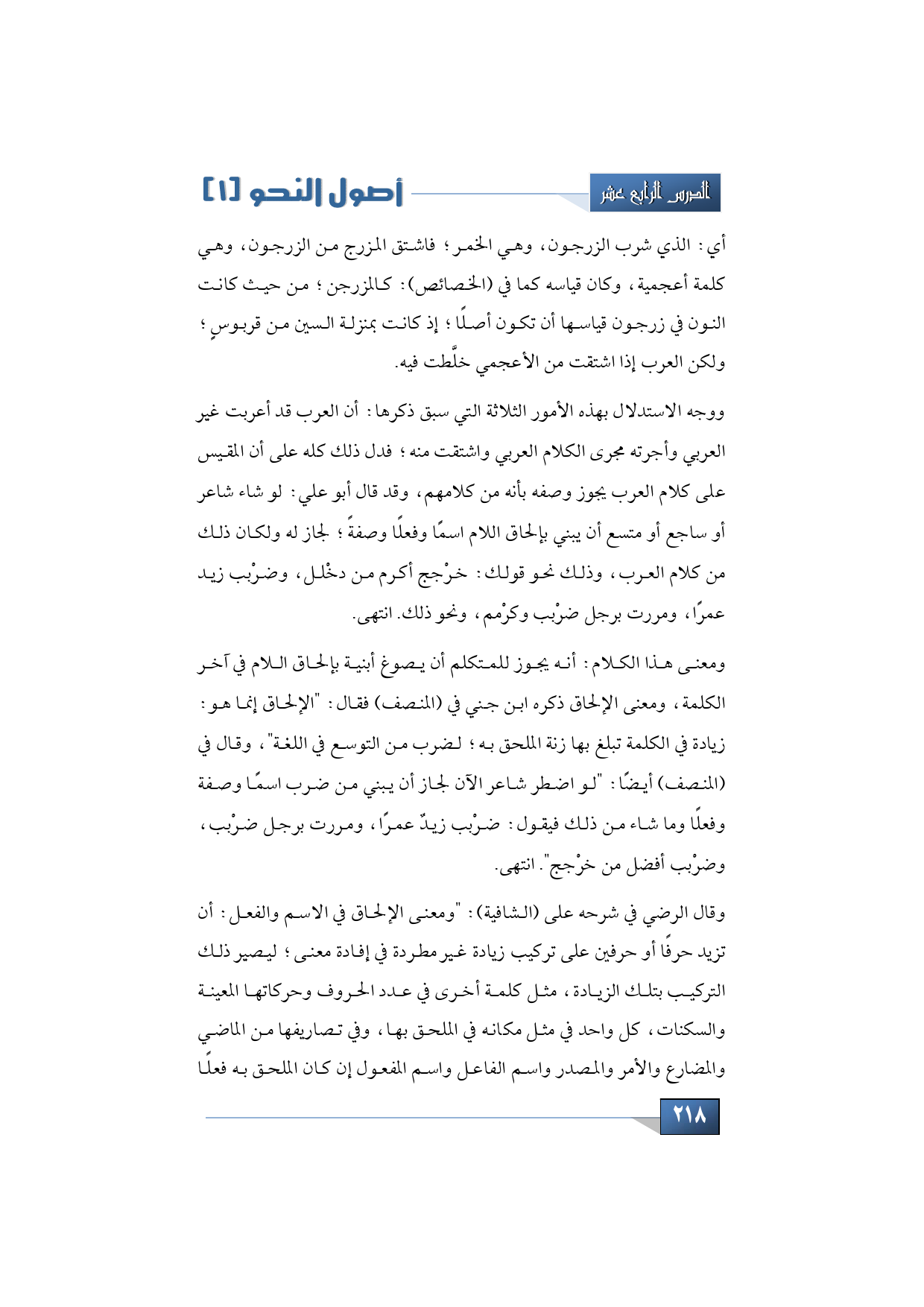 وقال الرضي في شرحه على (الشافية): "ومعنى الإلحاق في الاسم والفعل: أن تزيد حرفًا أو حرفين على تركيب زيادة غير مطردة في إفادة معنى؛ ليصير ذلك التركيب بتلك الزيادة، مثل كلمة أخرى في عدد الحروف وحركاتها المعينة والسكنات، كل واحد في مثل مكانه في الملحق بها، وفي تصاريفها من الماضي والمضارع والأمر والمصدر واسم الفاعل واسم المفعول إن كان الملحق به فعلًا