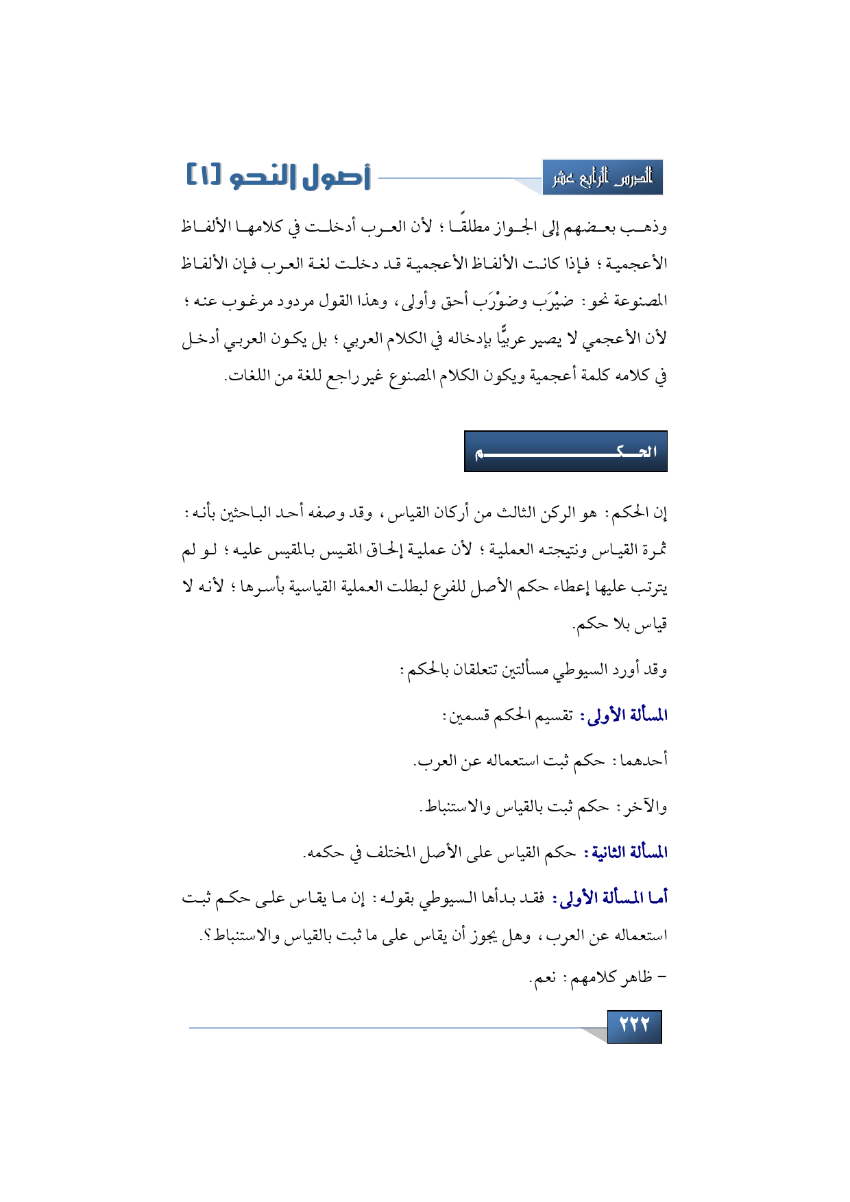 أما المسألة الأولى: فقد بدأها السيوطي بقوله: إن ما يقاس على حكم ثبت استعماله عن العرب، وهل يجوز أن يقاس على ما ثبت بالقياس والاستنباط؟.