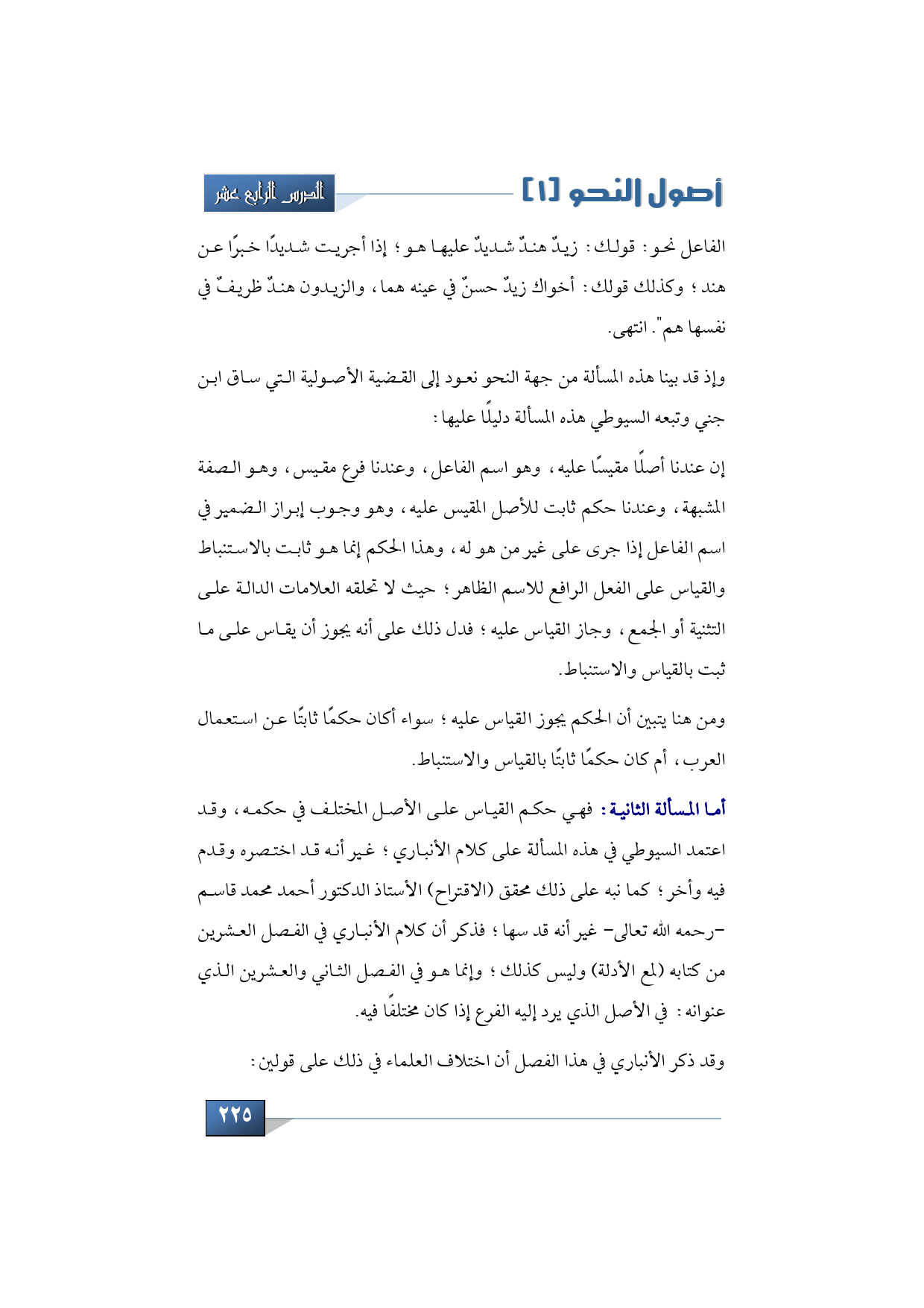 أما المسألة الثانية التي أوردها السيوطي في هذا الفصل فهي: حكم القياس على الأصل المختلف في حكمه، وقد اعتمد السيوطي في هذه المسألة على كلام الأنباري؛ غير أنه قد اختصره وقدم فيه وأخر؛ كما نبه على ذلك محقق (الاقتراح) الأستاذ الدكتور أحمد محمد قاسم -رحمه الله تعالى- غير أنه قد سها؛ فذكر أن كلام الأنباري في الفصل العشرين من كتابه (لمع الأدلة) وليس كذلك؛ وإنما هو في الفصل الثاني والعشرين الذي عنوانه: في الأصل الذي يرد إليه الفرع إذا كان مختلفًا فيه.