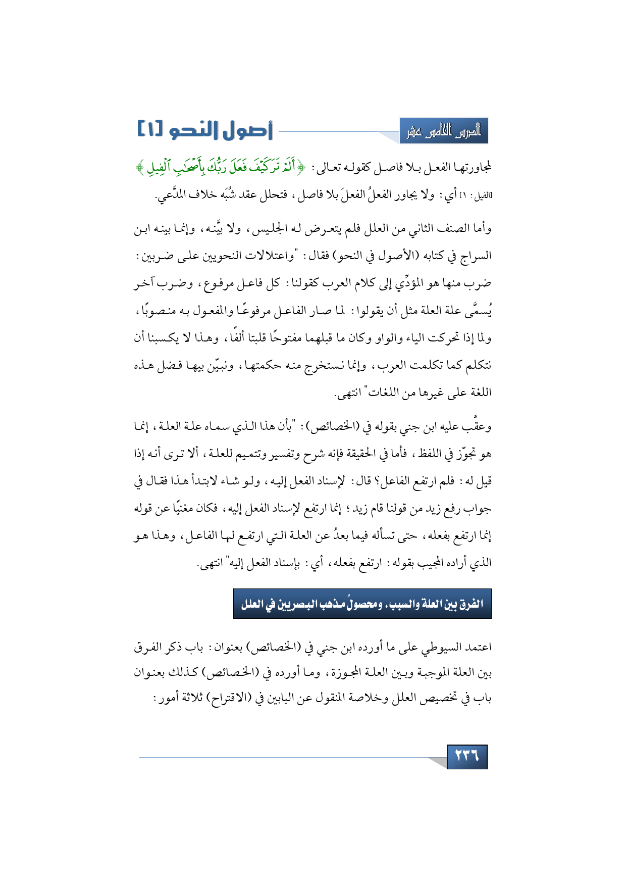 وأما الصنف الثاني من العلل فلم يتعرض له الجليس، ولا بيَّنه، وإنما بينه ابن السراج في كتابه (الأصول في النحو) فقال: "واعتلالات النحويين على ضربين: ضرب منها هو المؤدِّي إلى كلام العرب كقولنا: كل فاعل مرفوع، وضرب آخر يُسمَّى علة العلة مثل أن يقولوا: لما صار الفاعل مرفوعًا والمفعول به منصوبًا، ولما إذا تحركت الياء والواو وكان ما قبلهما مفتوحًا قلبتا ألفًا، وهذا لا يكسبنا أن نتكلم كما تكلمت العرب، وإنما نستخرج منه حكمتها، ونبيّن بيها فضل هذه اللغة على غيرها من اللغات" انتهى.