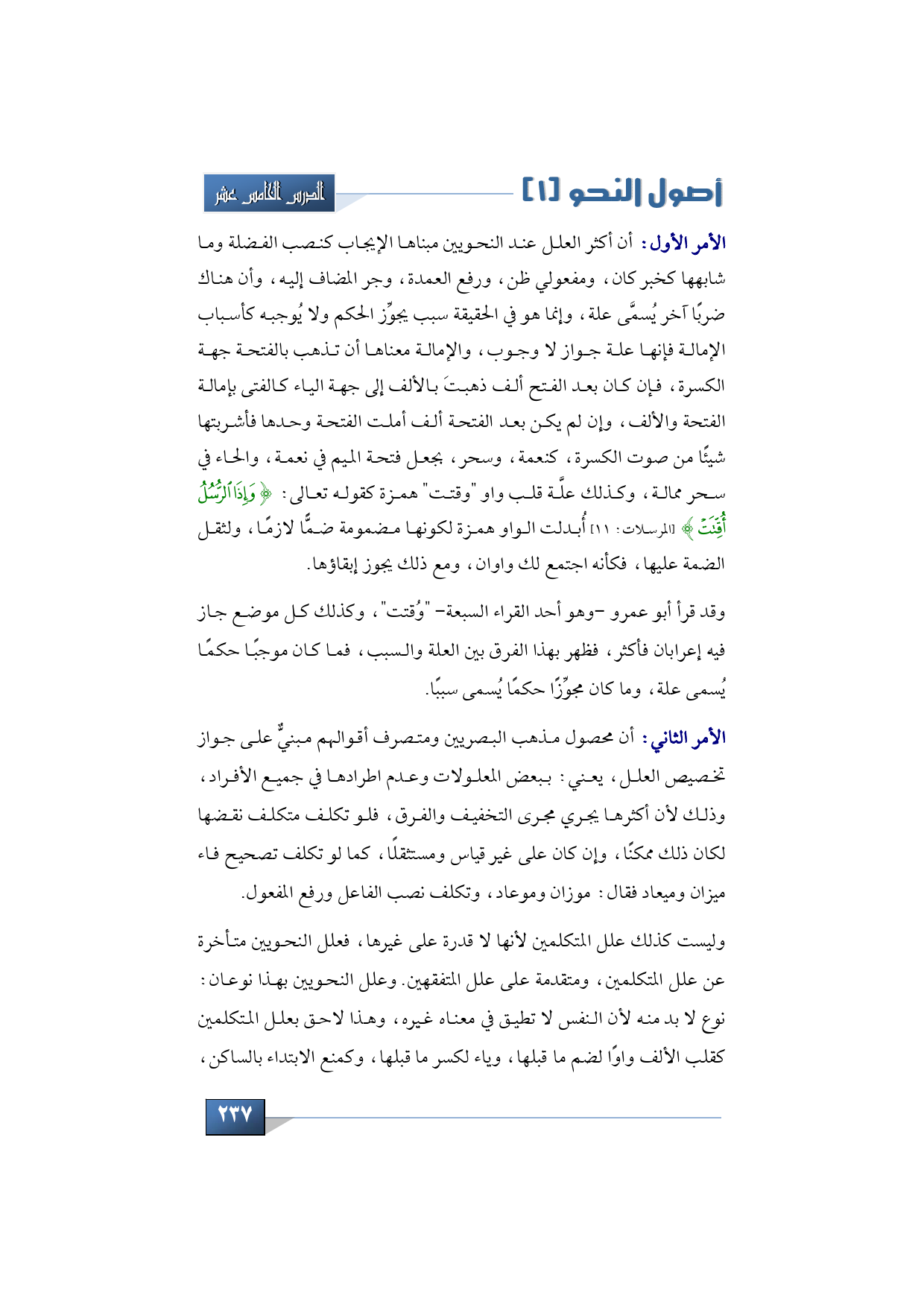 أولها: أن أكثر العلل عند النحويين مبناها الإيجاب كنصب الفضلة وما شابهها كخبر كان، ومفعولي ظن، ورفع العمدة، وجر المضاف إليه، وأن هناك ضربًا آخر يُسمَّى علة، وإنما هو في الحقيقة سبب يجوِّز الحكم ولا يُوجبه كأسباب الإمالة فإنها علة جواز لا وجوب، والإمالة معناها أن تذهب بالفتحة جهة الكسرة، فإن كان بعد الفتح ألف ذهبتَ بالألف إلى جهة الياء كالفتى بإمالة الفتحة والألف، وإن لم يكن بعد الفتحة ألف أملت الفتحة وحدها فأشربتها شيئًا من صوت الكسرة، كنعمة، وسحر، بجعل فتحة الميم في نعمة، والحاء في سحر ممالة، وكذلك علَّة قلب واو "وقتت" همزة كقوله تعالى: {وَإِذَا الرُّسُلُ أُقِّتَتْ} (المرسلات: 11) أُبدلت الواو همزة لكونها مضمومة ضمًّا لازمًا، ولثقل الضمة عليها، فكأنه اجتمع لك واوان، ومع ذلك يجوز إبقاؤها.