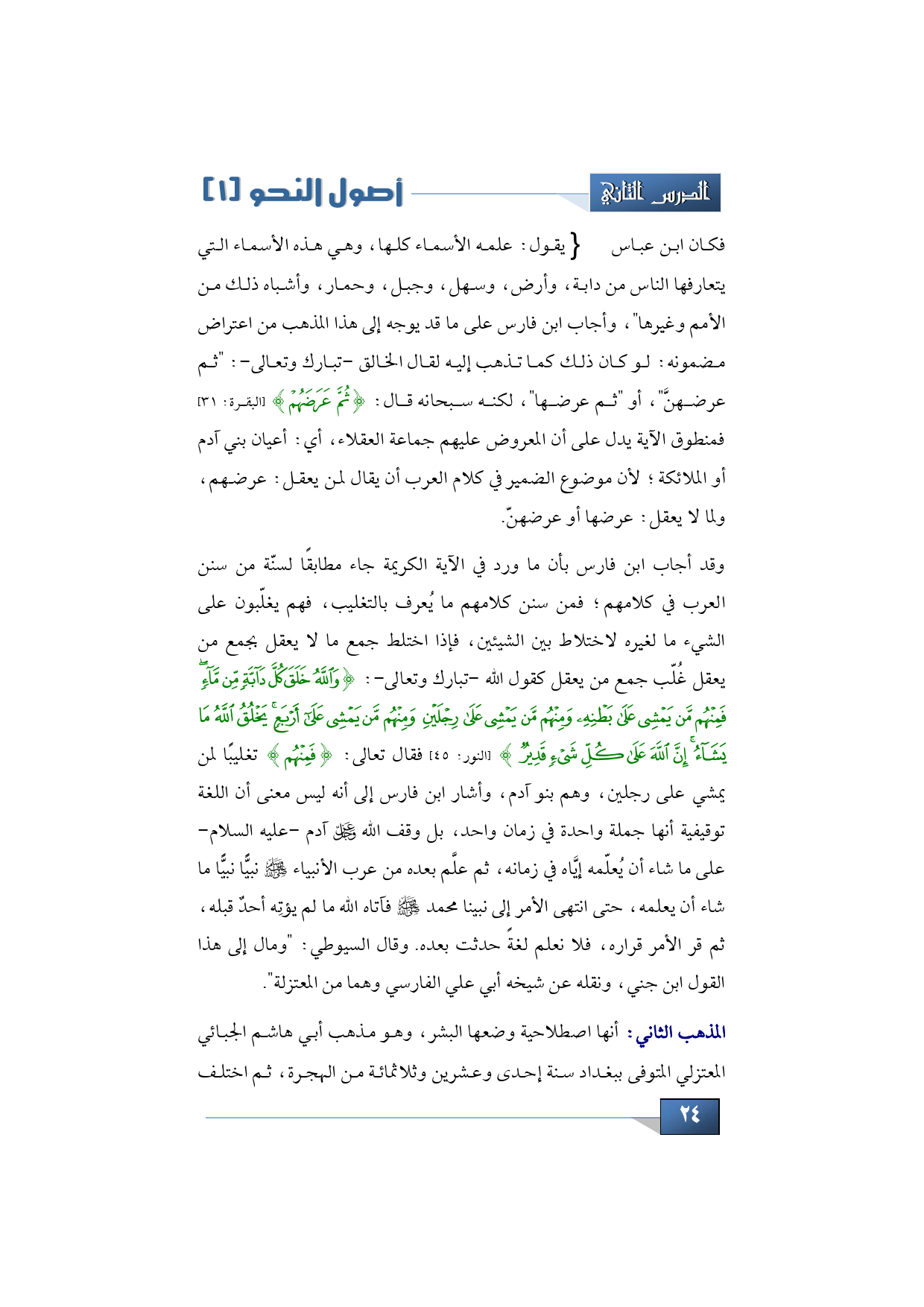فكان ابن عباس -رضي الله عنهما- يقول: علمه الأسماء كلها، وهي هذه الأسماء التي يتعارفها الناس من دابة، وأرض، وسهل، وجبل، وحمار، وأشباه ذلك من الأمم وغيرها"، وأجاب ابن فارس على ما قد يوجه إلى هذا المذهب من اعتراض مضمونه: لو كان ذلك كما تذهب إليه لقال الخالق -تبارك وتعالى-: "ثم عرضهنَّ"، أو "ثم عرضها"، لكنه سبحانه قال: {ثُمَّ عَرَضَهُمْ} (البقرة: 31) فمنطوق الآية يدل على أن المعروض عليهم جماعة العقلاء، أي: أعيان بني آدم أو الملائكة؛ لأن موضوع الضمير في كلام العرب أن يقال لمن يعقل: عرضهم، ولما لا يعقل: عرضها أو عرضهنّ.