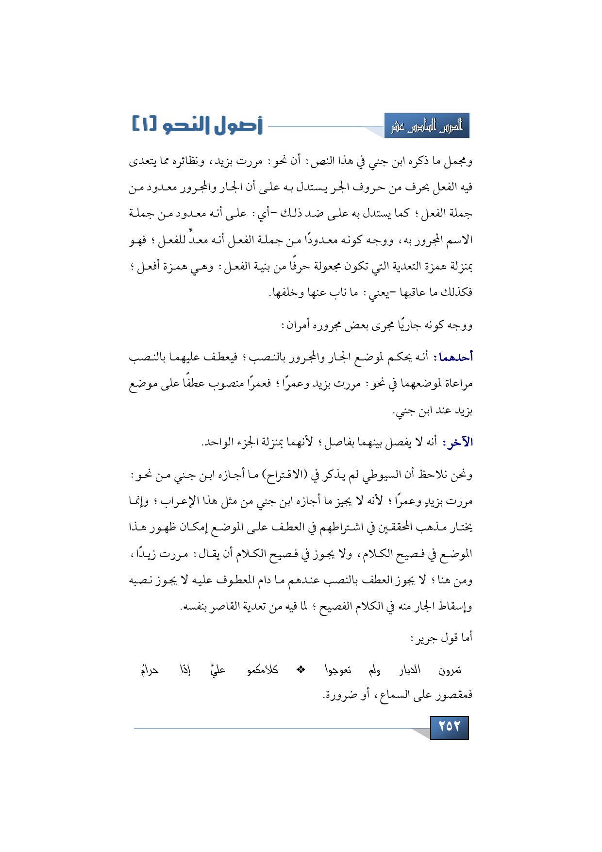 أحدهما: أنه يحكم لموضع الجار والمجرور بالنصب؛ فيعطف عليهما بالنصب مراعاة لموضعهما في نحو: مررت بزيد وعمرًا؛ فعمرًا منصوب عطفًا على موضع بزيد عند ابن جني.