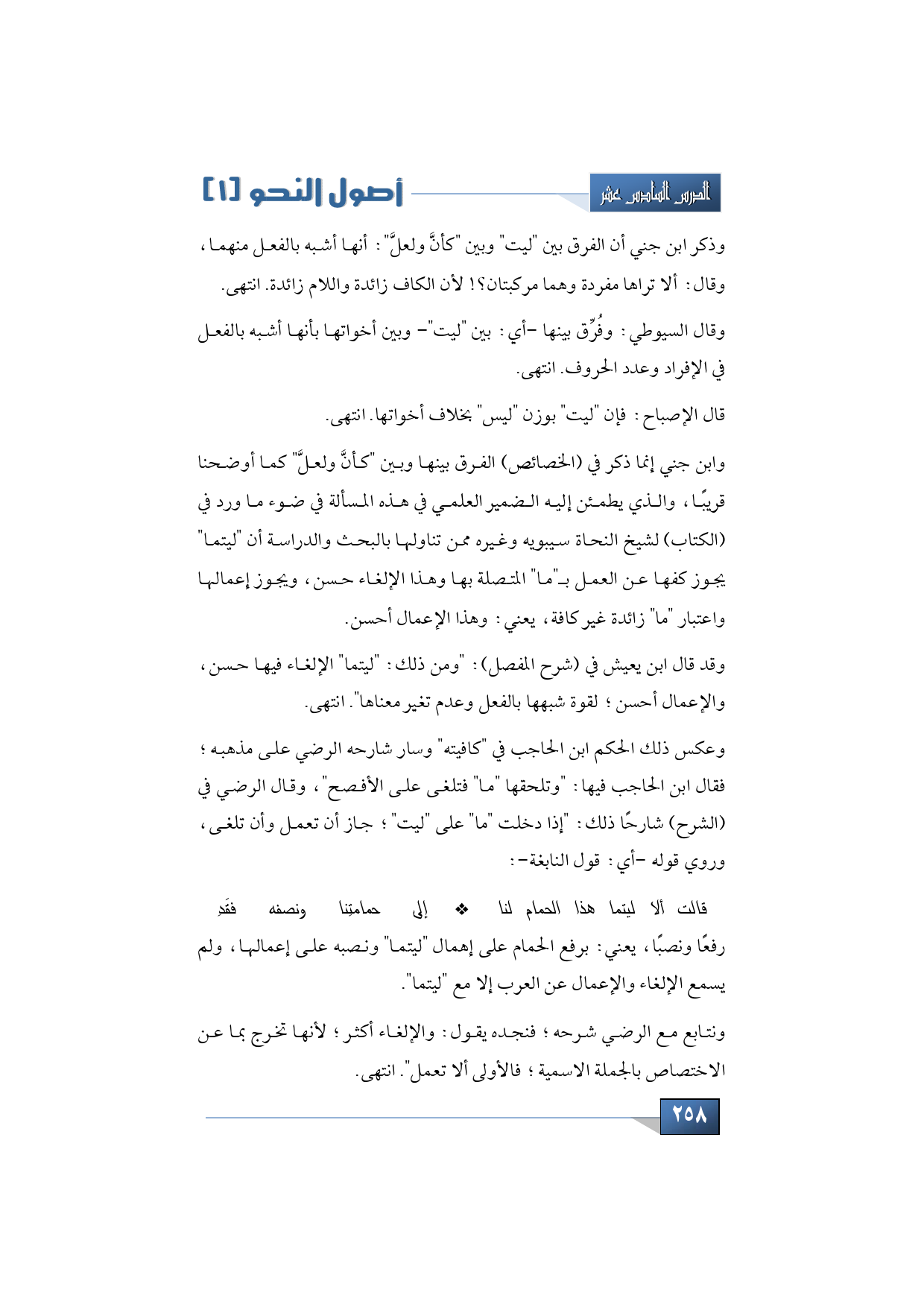 وقال السيوطي: وفُرِّق بينها -أي: بين "ليت"- وبين أخواتها بأنها أشبه بالفعل في الإفراد وعدد الحروف. انتهى.