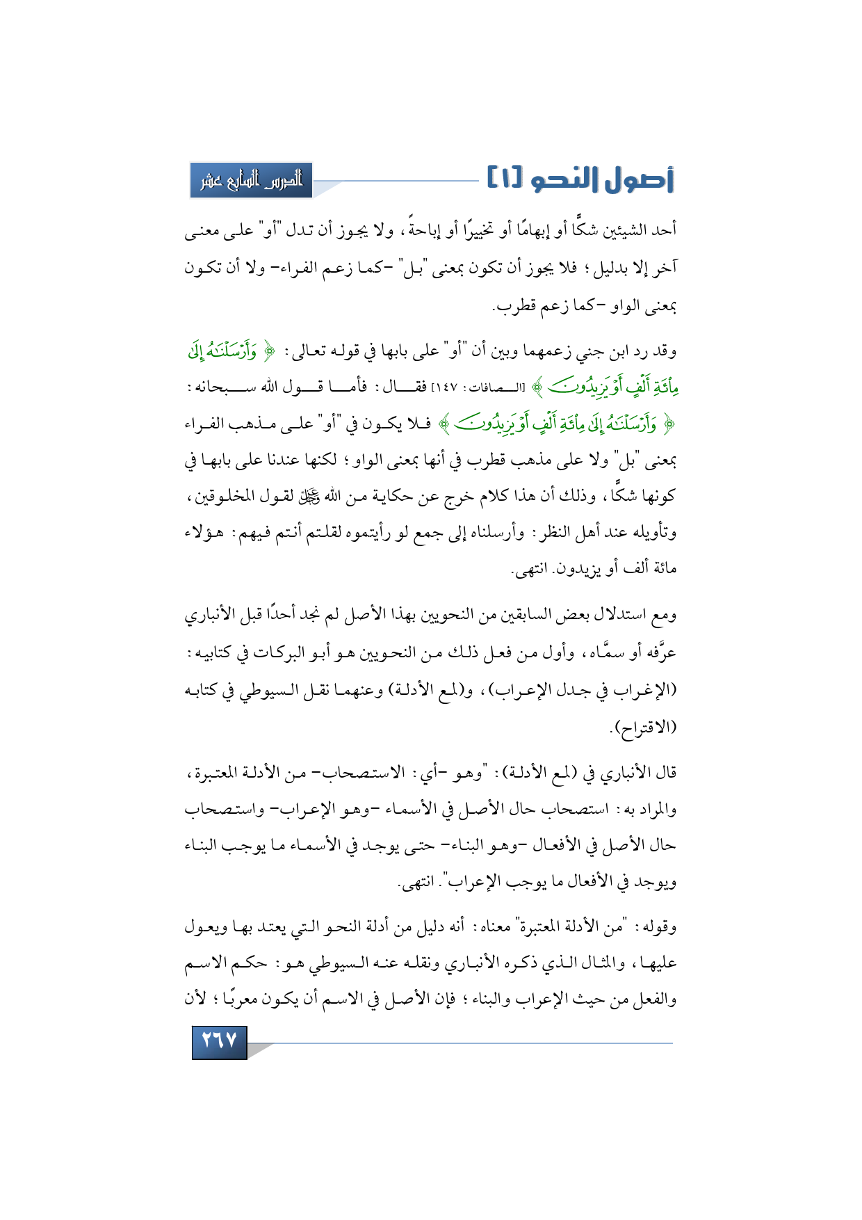وقد رد ابن جني زعمهما وبين أن "أو" على بابها في قوله تعالى: {وَأَرْسَلْنَاهُ إِلَى مِائَةِ أَلْفٍ أَوْ يَزِيدُونَ} (الصافات: 147) فقال: فأما قول الله سبحانه: {وَأَرْسَلْنَاهُ إِلَى مِائَةِ أَلْفٍ أَوْ يَزِيدُونَ} فلا يكون في "أو" على مذهب الفراء بمعنى "بل" ولا على مذهب قطرب في أنها بمعنى الواو؛ لكنها عندنا على بابها في كونها شكًّا، وذلك أن هذا كلام خرج عن حكاية من الله -عز وجل- لقول المخلوقين، وتأويله عند أهل النظر: وأرسلناه إلى جمع لو رأيتموه لقلتم أنتم فيهم: هؤلاء مائة ألف أو يزيدون. انتهى.