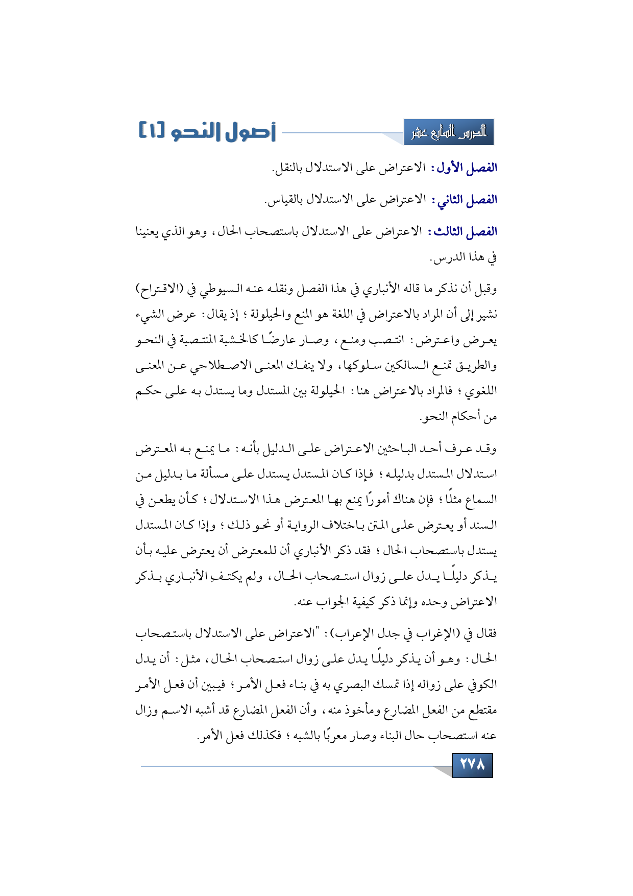 وقبل أن نذكر ما قاله الأنباري في هذا الفصل ونقله عنه السيوطي في (الاقتراح) نشير إلى أن المراد بالاعتراض في اللغة هو المنع والحيلولة؛ إذ يقال: عرض الشيء يعرض واعترض: انتصب ومنع، وصار عارضًا كالخشبة المنتصبة في النحو والطريق تمنع السالكين سلوكها، ولا ينفك المعنى الاصطلاحي عن المعنى اللغوي؛ فالمراد بالاعتراض هنا: الحيلولة بين المستدل وما يستدل به على حكم من أحكام النحو.