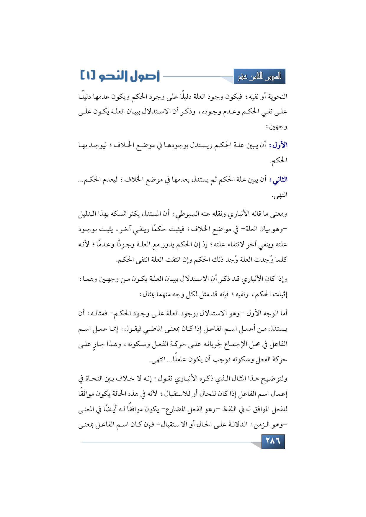 النحوية أو نفيه؛ فيكون وجود العلة دليلًا على وجود الحكم ويكون عدمها دليلًا على نفي الحكم وعدم وجوده، وذكر أن الاستدلال ببيان العلة يكون على وجهين: