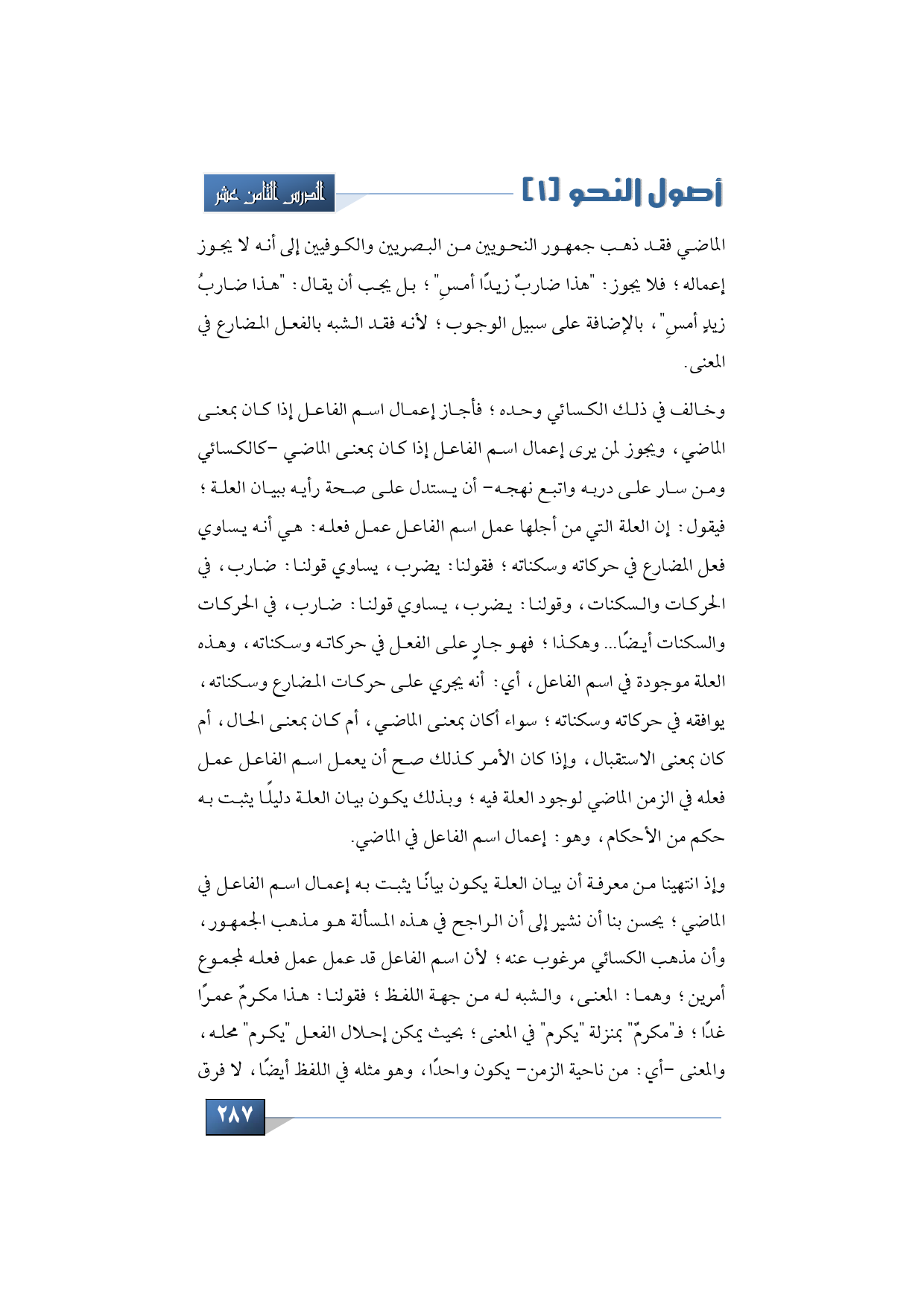 وخالف في ذلك الكسائي وحده؛ فأجاز إعمال اسم الفاعل إذا كان بمعنى الماضي، ويجوز لمن يرى إعمال اسم الفاعل إذا كان بمعنى الماضي -كالكسائي ومن سار على دربه واتبع نهجه- أن يستدل على صحة رأيه ببيان العلة؛ فيقول: إن العلة التي من أجلها عمل اسم الفاعل عمل فعله: هي أنه يساوي فعل المضارع في حركاته وسكناته؛ فقولنا: يضرب، يساوي قولنا: ضارب، في الحركات والسكنات، وقولنا: يضرب، يساوي قولنا: ضارب، في الحركات والسكنات أيضًا ... وهكذا؛ فهو جارٍ على الفعل في حركاته وسكناته، وهذه العلة موجودة في اسم الفاعل، أي: أنه يجري على حركات المضارع وسكناته، يوافقه في حركاته وسكناته؛ سواء أكان بمعنى الماضي، أم كان بمعنى الحال، أم كان بمعنى الاستقبال، وإذا كان الأمر كذلك صح أن يعمل اسم الفاعل عمل فعله في الزمن الماضي لوجود العلة فيه؛ وبذلك يكون بيان العلة دليلًا يثبت به حكم من الأحكام، وهو: إعمال اسم الفاعل في الماضي.