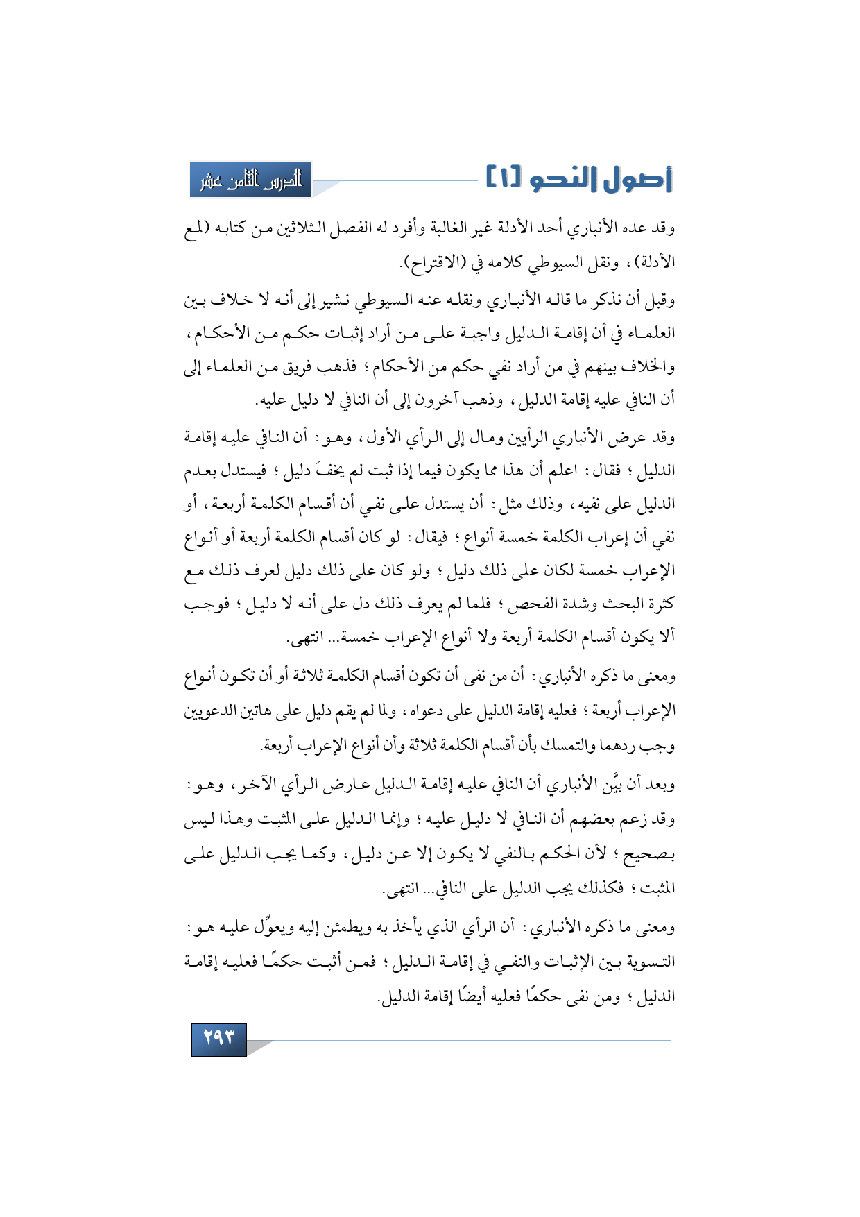 وقد عرض الأنباري الرأيين ومال إلى الرأي الأول، وهو: أن النافي عليه إقامة الدليل؛ فقال: اعلم أن هذا مما يكون فيما إذا ثبت لم يخفَ دليل؛ فيستدل بعدم الدليل على نفيه، وذلك مثل: أن يستدل على نفي أن أقسام الكلمة أربعة، أو نفي أن إعراب الكلمة خمسة أنواع؛ فيقال: لو كان أقسام الكلمة أربعة أو أنواع الإعراب خمسة لكان على ذلك دليل؛ ولو كان على ذلك دليل لعرف ذلك مع كثرة البحث وشدة الفحص؛ فلما لم يعرف ذلك دل على أنه لا دليل؛ فوجب ألا يكون أقسام الكلمة أربعة ولا أنواع الإعراب خمسة ... انتهى.