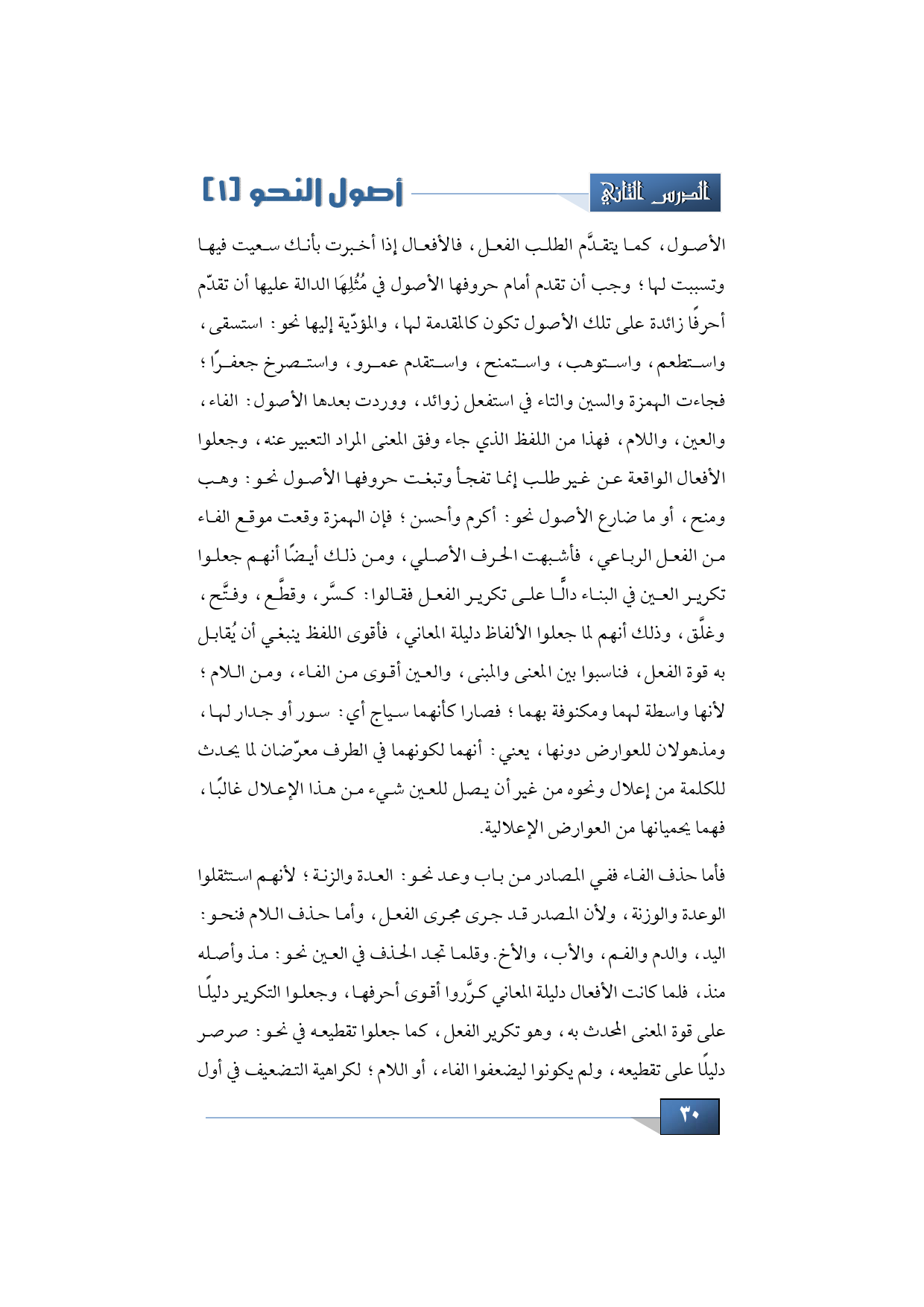 فأما حذف الفاء ففي المصادر من باب وعد نحو: العدة والزنة؛ لأنهم استثقلوا الوعدة والوزنة، ولأن المصدر قد جرى مجرى الفعل، وأما حذف اللام فنحو: اليد، والدم والفم، والأب، والأخ. وقلما تجد الحذف في العين نحو: مذ وأصله منذ، فلما كانت الأفعال دليلة المعاني كرَّروا أقوى أحرفها، وجعلوا التكرير دليلًا على قوة المعنى المحدث به، وهو تكرير الفعل، كما جعلوا تقطيعه في نحو: صرصر دليلًا على تقطيعه، ولم يكونوا ليضعفوا الفاء، أو اللام؛ لكراهية التضعيف في أول